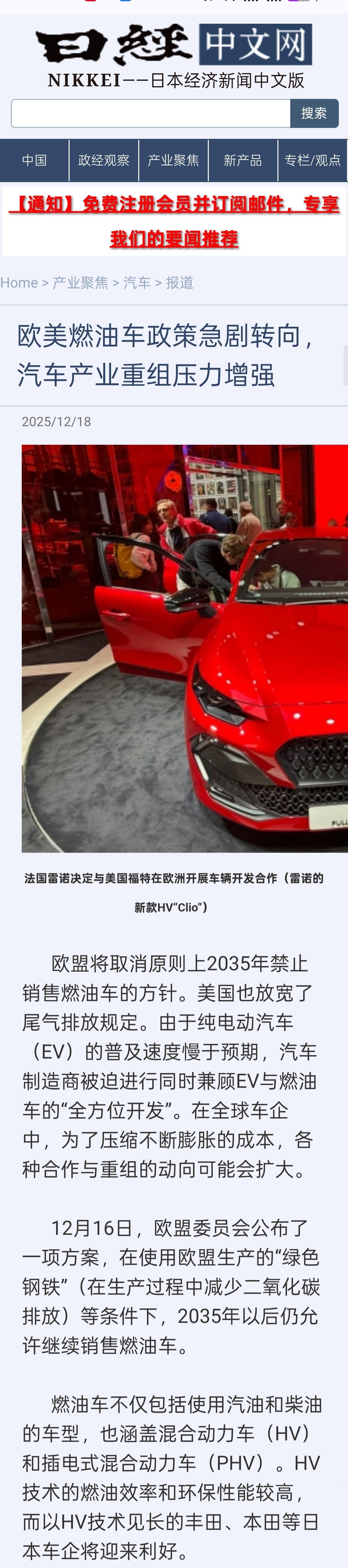 面对来自各国政府和汽车制造商的巨大压力,欧盟官员周二(12月16日)提议放宽原定于2035年生效的内燃机汽车销售禁令。新提案将原定的“零排放”标准调整为减排90%,旨在为内燃机技术保留生存空间,并帮助汽车工业灵活应对气候目标。根据提议,制造商必须通过使用低碳工艺生产的“绿色钢铁”,以及使用由可再生电力和捕获的二氧化碳制成的气候中性“电子燃料(e-fuels)”或生物燃料,来抵消汽车产生的额外排放。分析认为,随着欧盟将取消原则上2035年禁止销售燃油车的方针,美国也放宽了尾气排放规定,由于纯电动汽车(EV)的普及速度慢于预期,汽车制造商被迫进行同时兼顾EV与燃油车的“全方位开发”。在全球车企中,为了压缩不断膨胀的成本,各种合作与重组的动向可能会扩大。