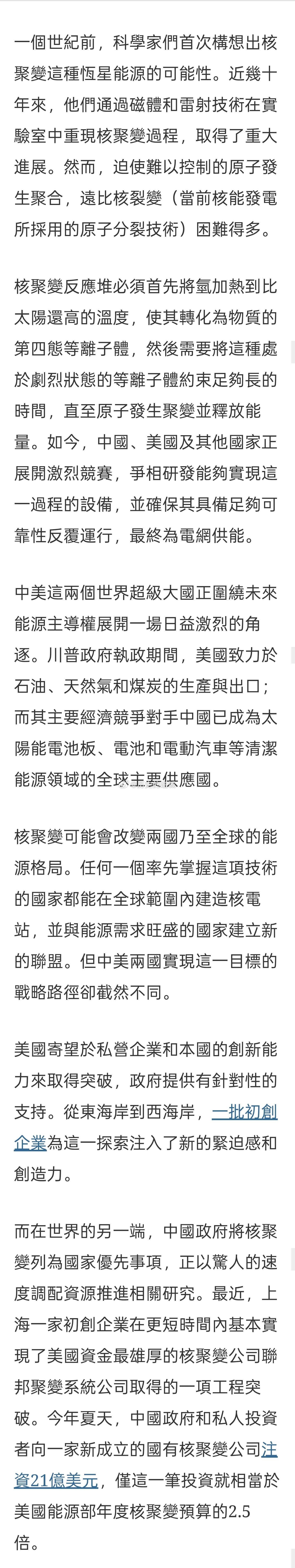 nyt最新文章关注到中美两个超级大国在核聚变领域的竞争。任何一个率先掌握这项技术的国家都能在全球范围内建造核电站,并与能源需求旺盛的国家建立新的联盟。 但中美两国实现这一目标的战略路径却截然不同。美国寄望于私营企业和本国的创新能力来取得突破,政府提供有针对性的支持。 从东海岸到西海岸,一批初创企业为这一探索注入了新的紧迫感和创造力。而在世界的另一端,中国将核聚变列为国家优先事项,正以惊人的速度调配资源推进相关研究。加州大学全球冲突与合作研究所高级研究员吉米·古德里奇表示,在这方面,中国在工程和建设领域的专业知识赋予了其独特优势。“美国面临的风险是,我们可能率先找到可行的技术路径,但中国会比我们更快实现工程化和规模化应用”,他指出。