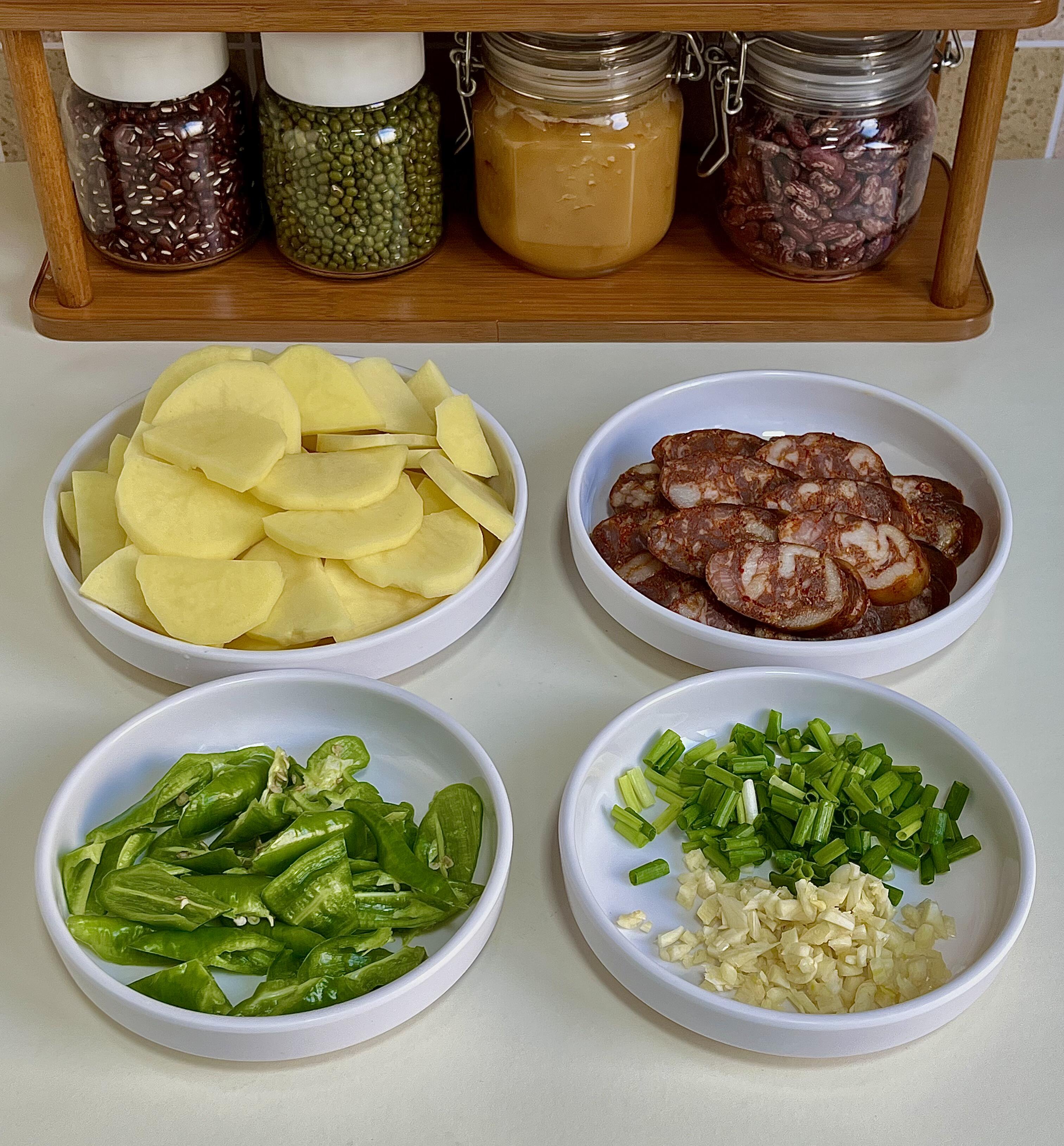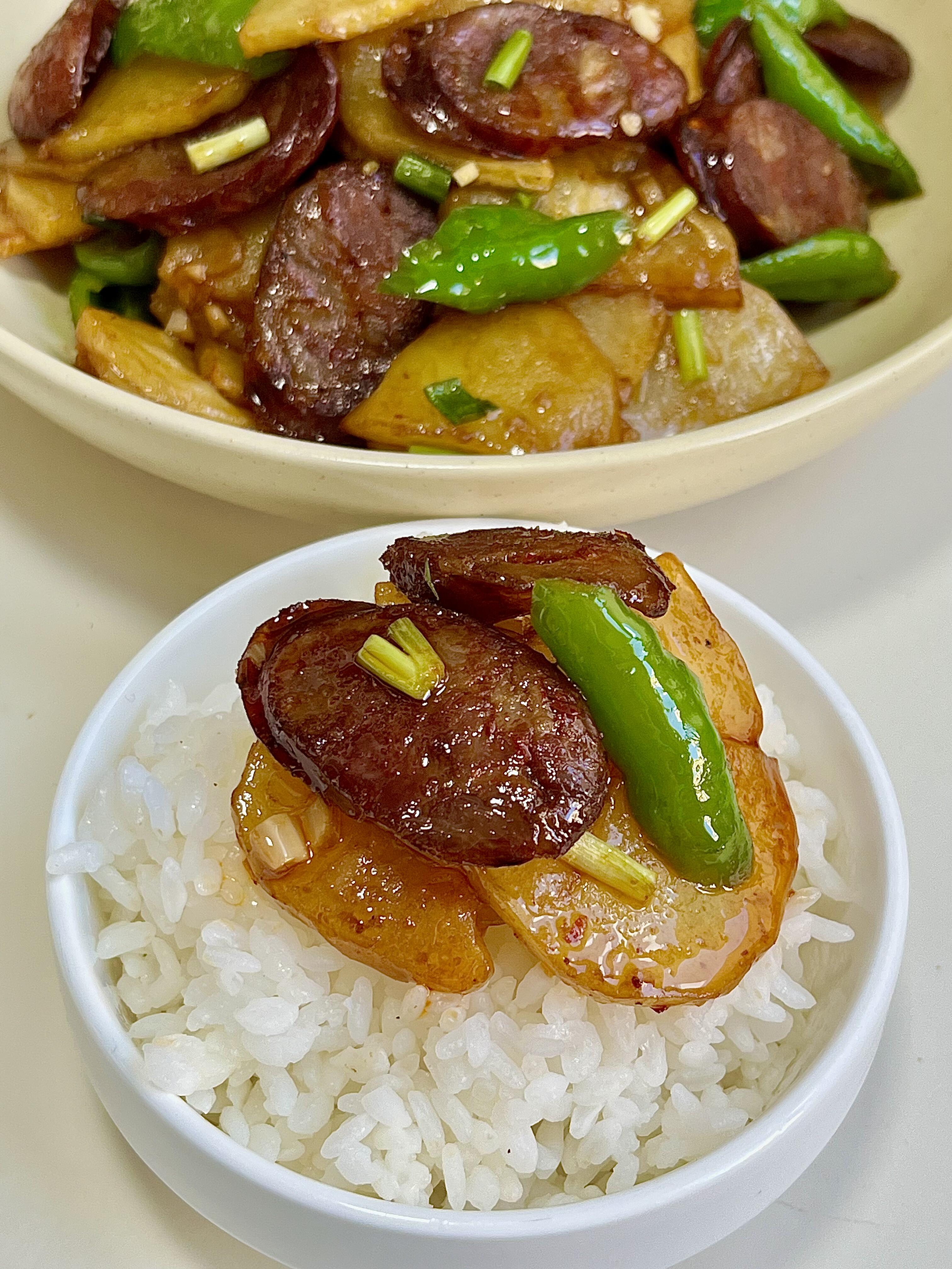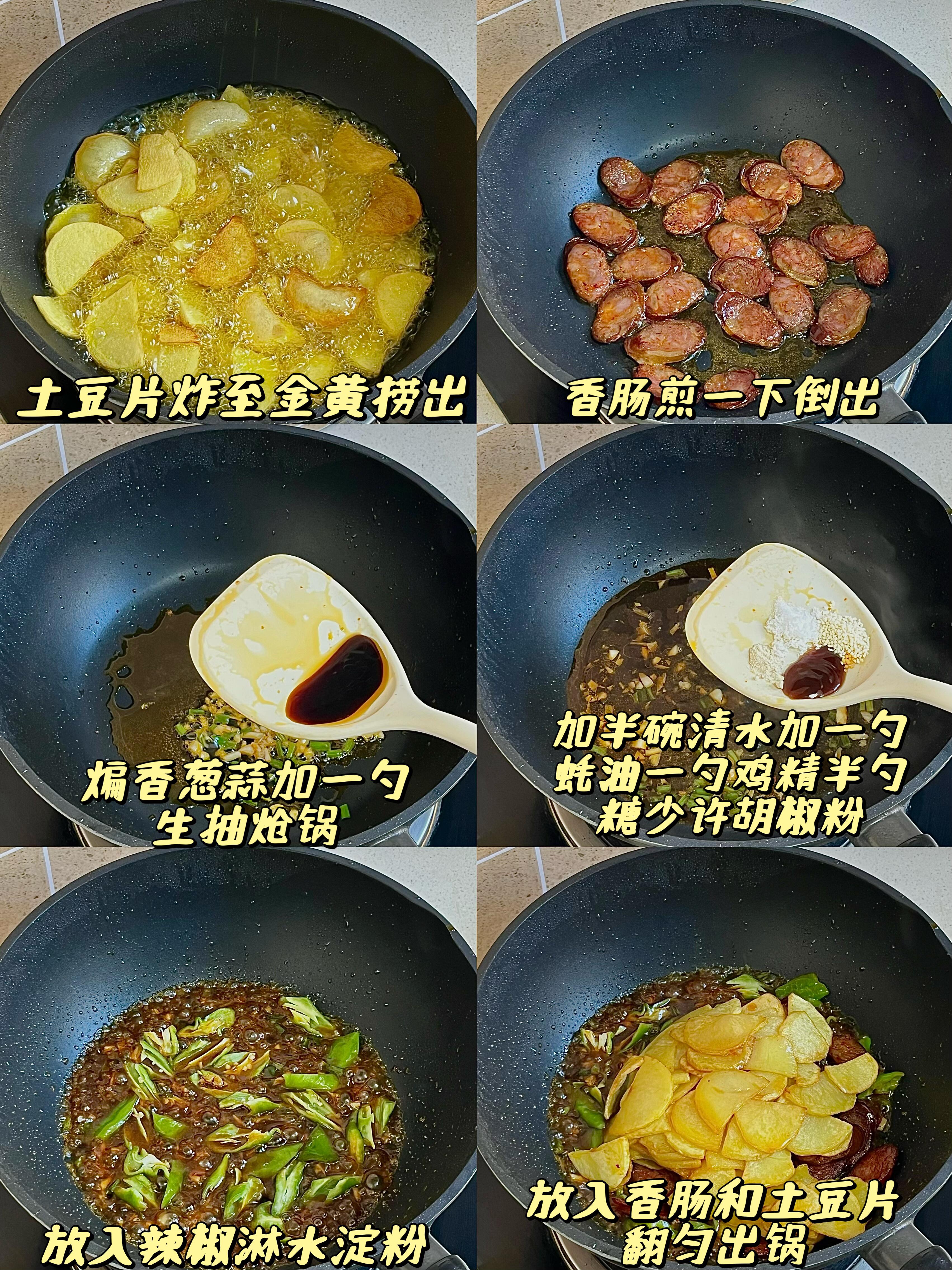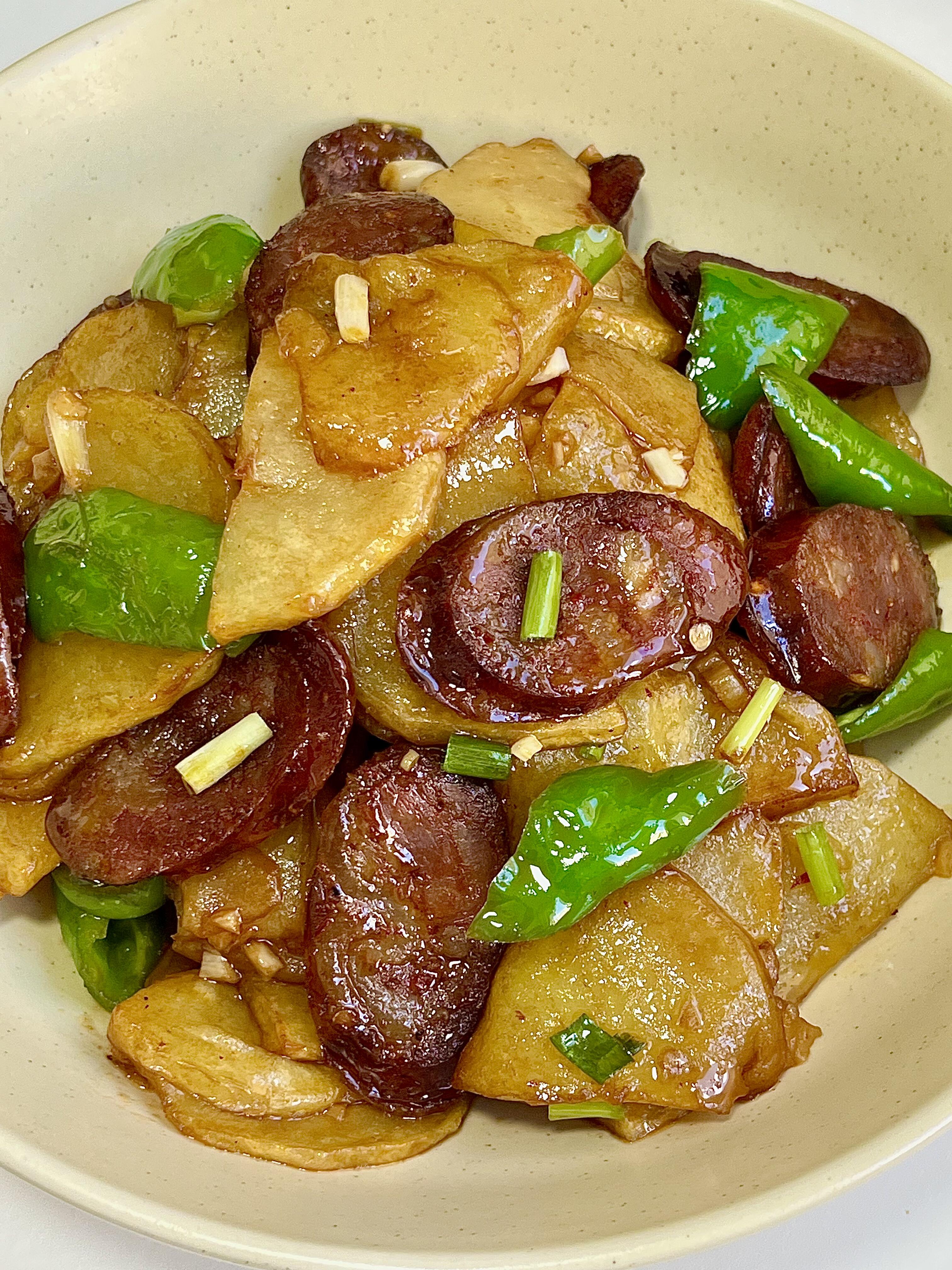 肥瘦相间的香肠煎得滋滋冒油,加上土豆片的软糯吸满香肠的咸香,每一口都绵密够味,一点不柴也不腻,不管是配白米饭、还是搭馒头都绝了! 步骤: 1)麻辣猪肉香肠蒸熟冷却后切三毫米厚的片,土豆切四毫米厚的片洗去淀粉,螺丝椒切滚刀块,切葱花蒜末 2)油温六成热下入土豆片,炸至金黄捞出,香肠煎一下倒出,煎肠出的油煸香葱蒜,一勺生抽炝锅,加半碗清水、一勺蚝油、一勺鸡精、半勺糖、少许胡椒粉,放入辣椒淋水淀粉,放入土豆和香肠翻匀出锅