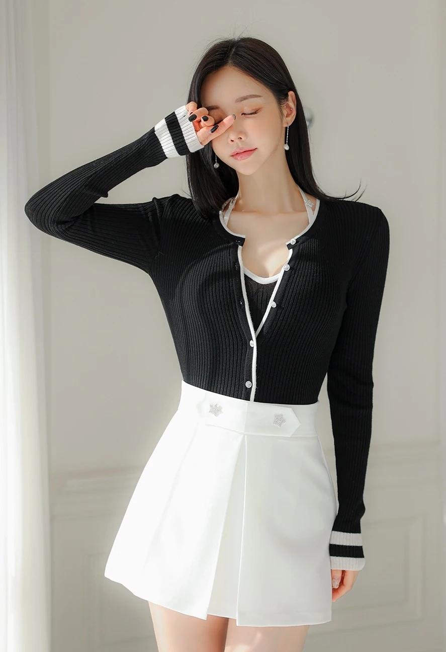 孙允珠的黑白色调穿搭,真的是简约又时尚的典范。 就说她那套白黑线条针织裙,白色基