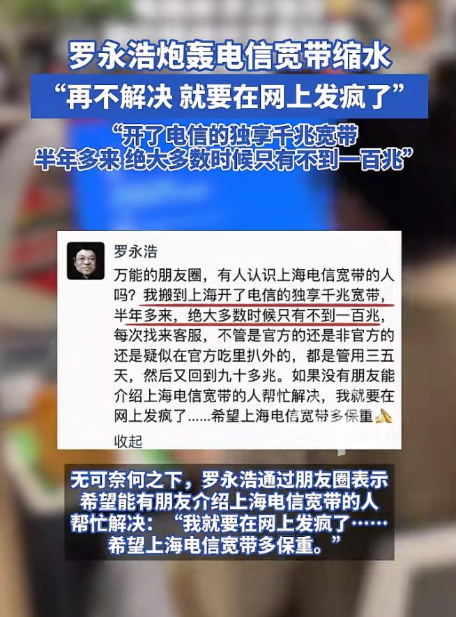 罗永浩又放大招了,这次是剑指中国电信。 他发了一条朋友圈,吐槽上海电信,说他明明开了千兆独享宽带,但是大部分时候只有百兆,他找了客服很多次,但是都没有解决问题,他还说,如果再不解决,他就要在网上发疯了。 罗永浩的的战斗力大家都知道,无论是大战新东方俞敏洪,还是和西贝的预制场大战,都是大获全胜,这中国电信要是再不给他解决这个问题,口碑恐怕保不住了。 我也支持罗永浩硬刚中国电信,套餐五花八门,叫法不一样,就是让你听不懂,多问两句给你甩脸子,有什么问题只能去投诉才给解决,希望罗永浩整顿。