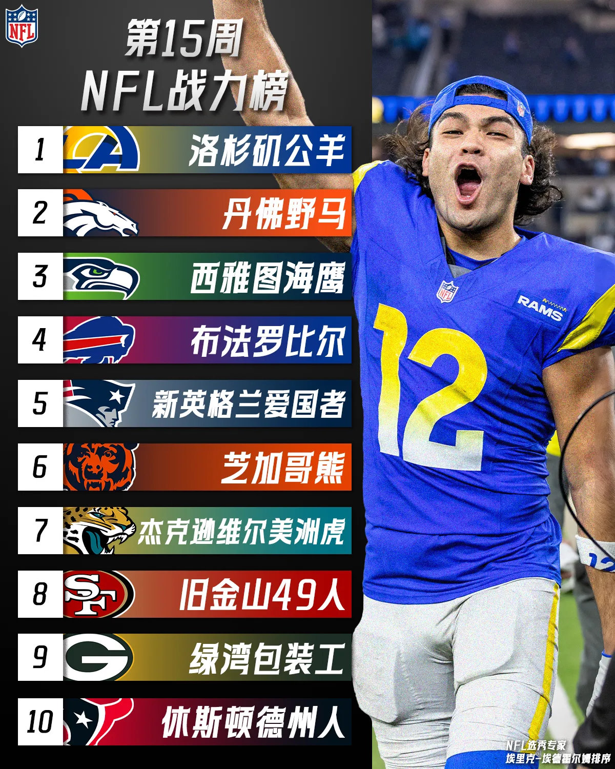 虎扑12月19日讯近日NFL官方发布第15周后NFL的战力榜: