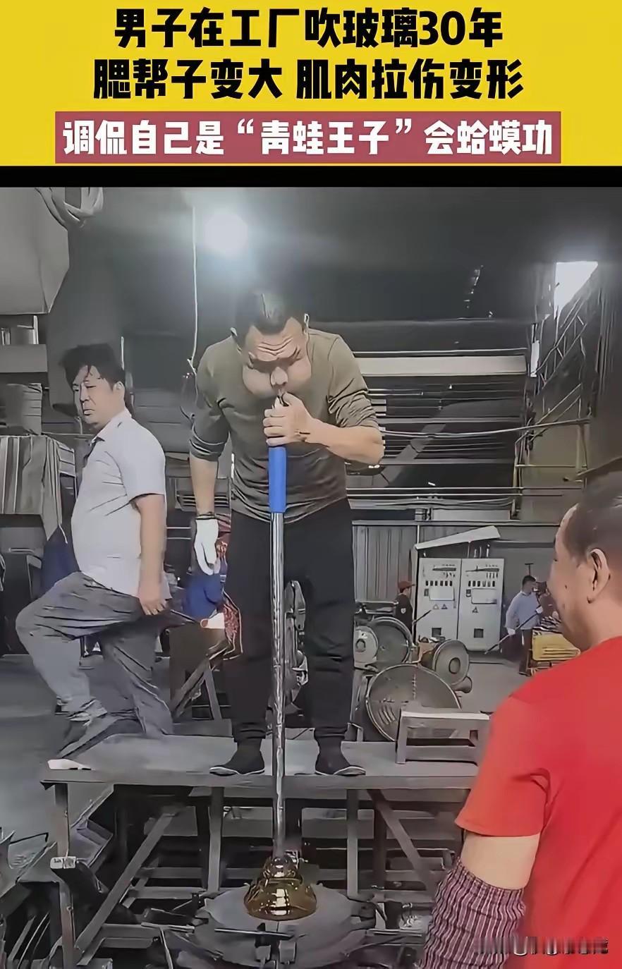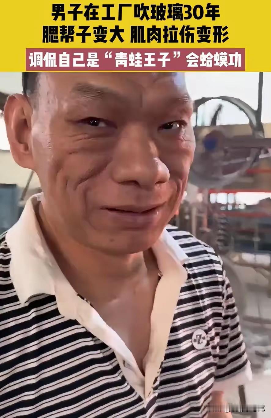 这个真笑不出来!广东一男子在工厂干活干了30年,因为常年都要吹玻璃,导致两个腮帮子变大,只要一吹气,两边就会鼓起来,连他自己都调侃是“青蛙王子”会蛤蟆功。网友:30年练就蛤蟆功,这才是真·工匠精神! 吹玻璃不是动动嘴那么简单,高温炉前的热浪烤得人难受,玻璃液粘稠滚烫,每一次吹气都要拿捏好分寸,轻了不成型,重了就吹破,全靠腮帮子的力气和手上的经验。 三十年日复一日,别人换了一波又一波工作,他却守着这门手艺。腮帮子从紧致到鼓胀,是无数次憋气、吹气练出来的“职业印记”,疼的时候可能自己揉一揉就接着干,累的时候咬咬牙也没放弃。 他调侃自己是青蛙王子,鼓起来的腮帮子,藏着的是养家糊口的责任,是对职业的敬畏,更是实打实的工匠精神。这份乐观让人会心一笑,可笑着笑着就忍不住心疼。 现在大家总说“工匠精神”,真正的匠心从来不是光鲜亮丽的标签,而在平凡岗位上默默打磨,把一件事做到极致。 没人觉得他的“青蛙腮”不好看,反而觉得这是最光荣的勋章,比任何装饰都珍贵。 网友的点赞,是对劳动者的认可,是对这份坚守的致敬。 咱们身边总有这样的普通人,他们干着不起眼的活儿,日复一日重复着同样的动作,用汗水换生计,用坚守筑匠心。 这个吹玻璃的男子,用三十年的时光告诉我们,了不起就是把平凡的事坚持做、用心做。为他点赞,也为每一个在平凡岗位上默默耕耘的劳动者点赞,他们的坚持,给这个社会抹了最温暖的底色。