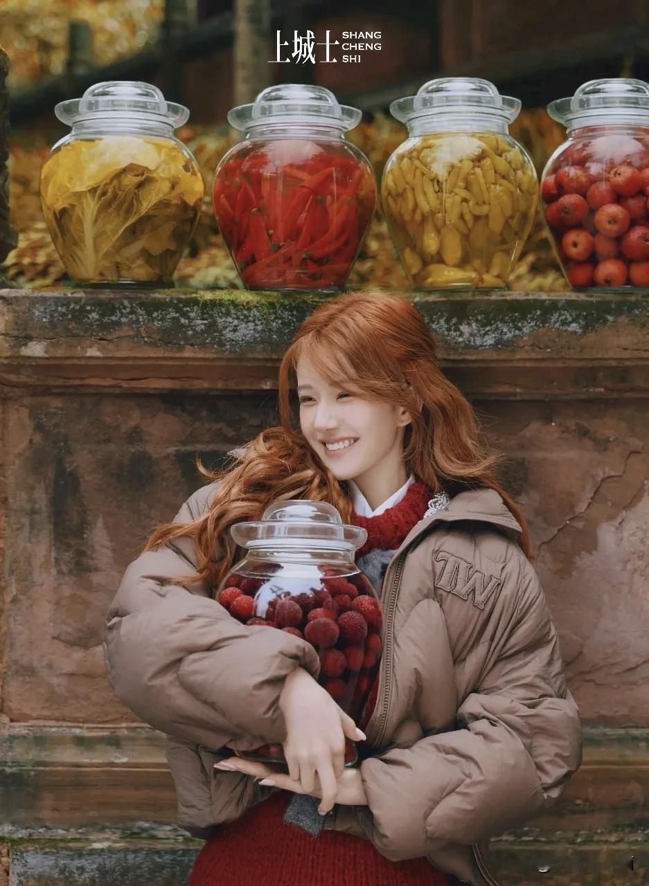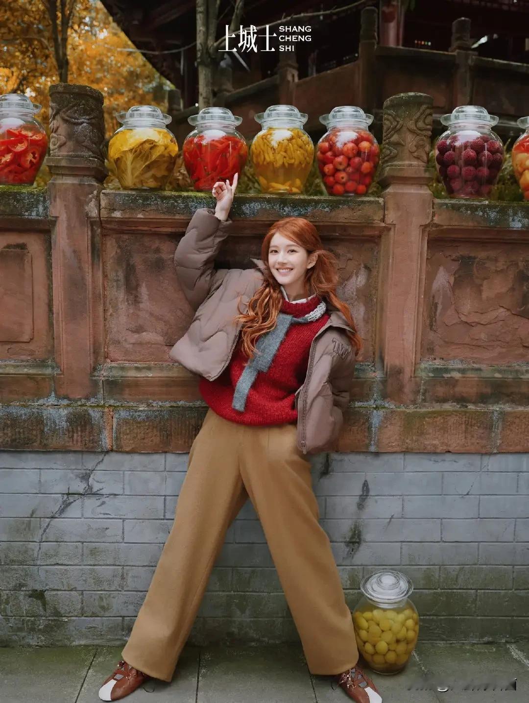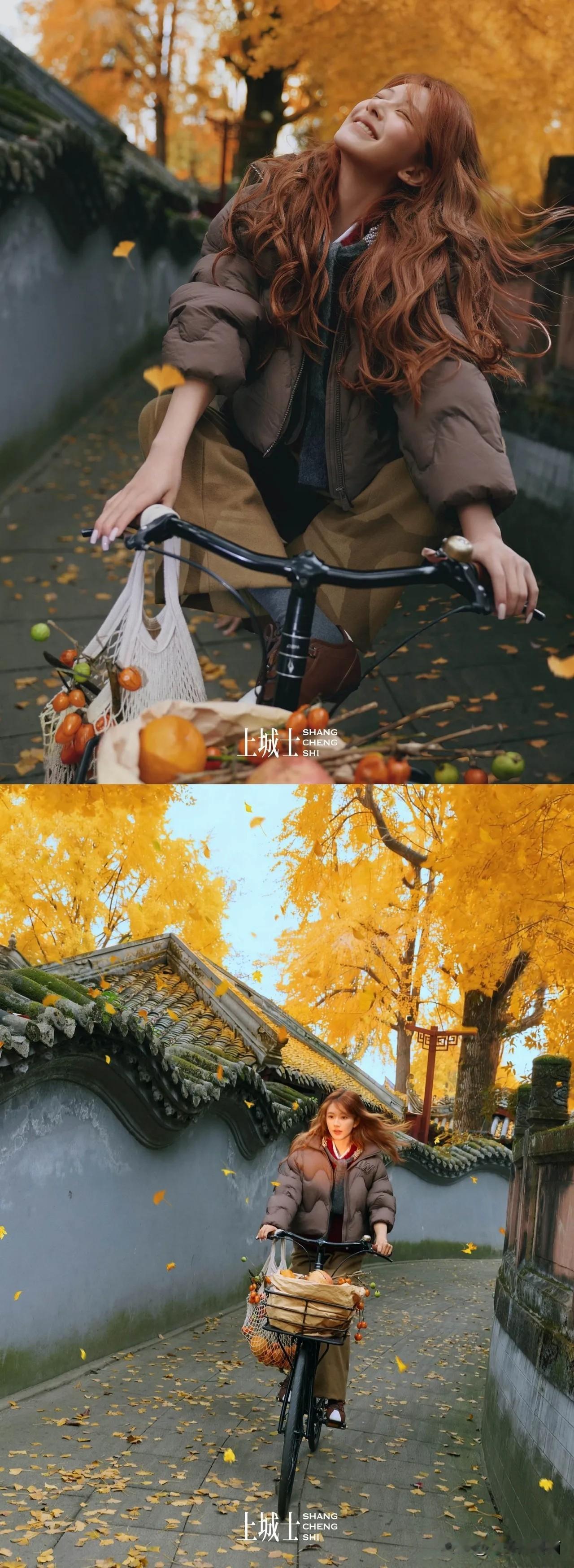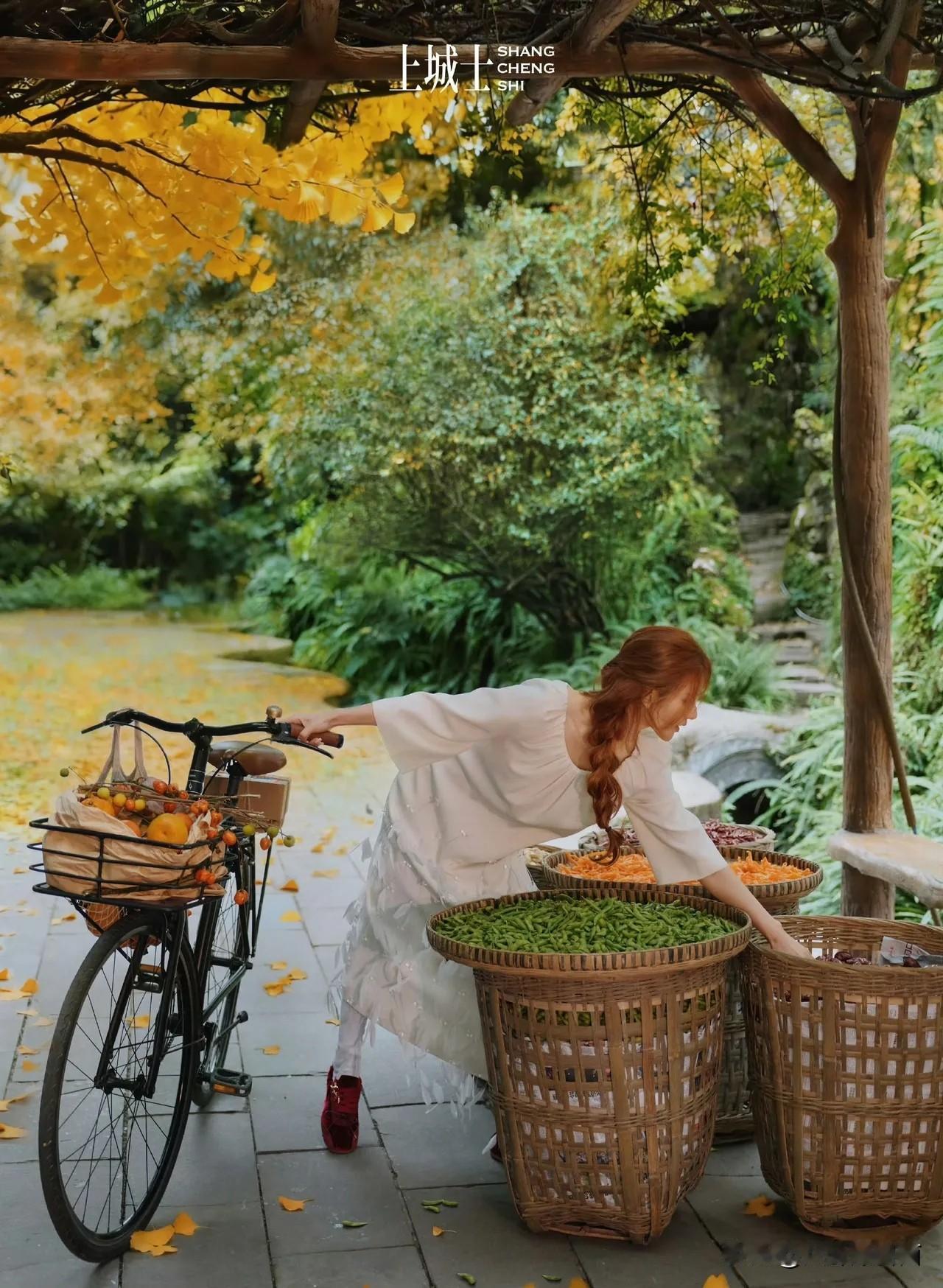 红色与金色的碰撞,温柔又大气。 身穿绿裙和身后的景色融为一体,就像一幅精彩的油画。 跨上的自行车松弛与雀跃,让她整个人显得十分柔和。 老墙石栏上的泡菜,是记忆中家乡最原始的味道。