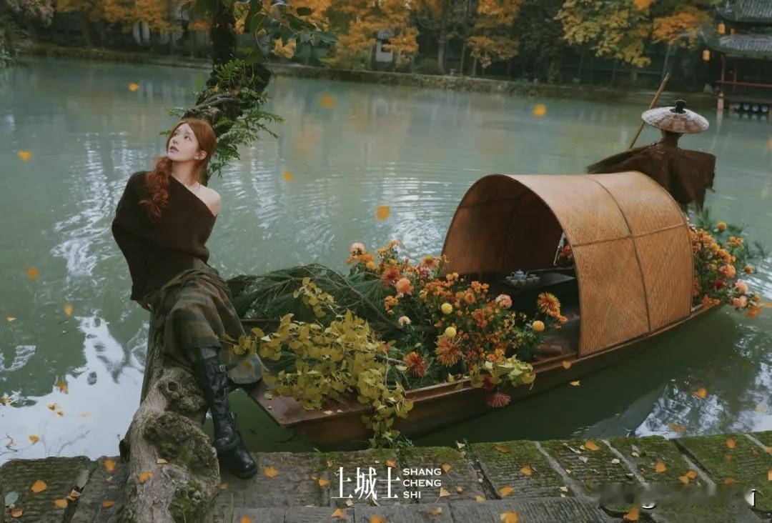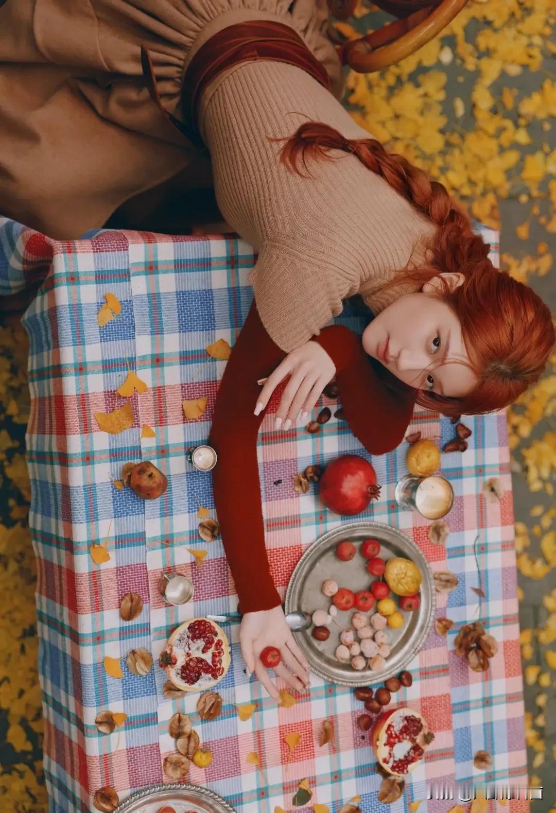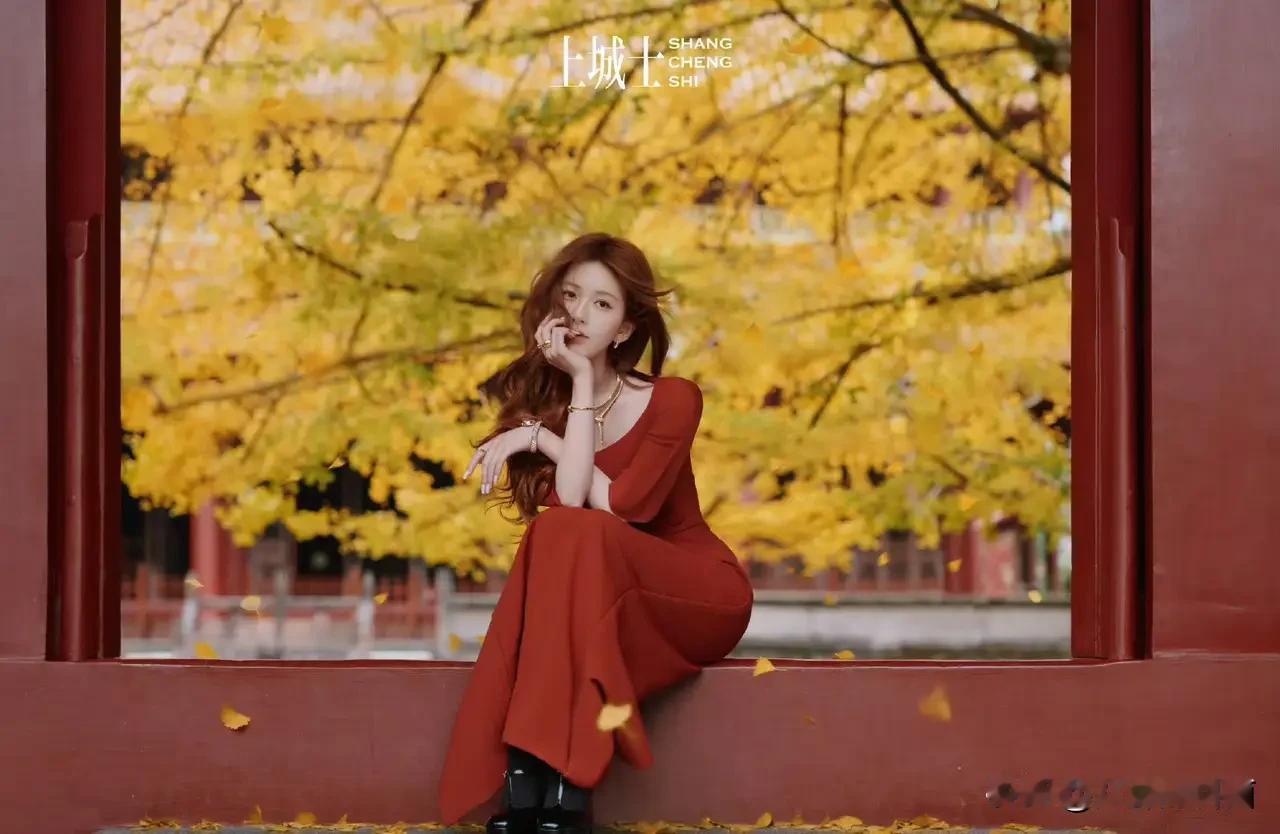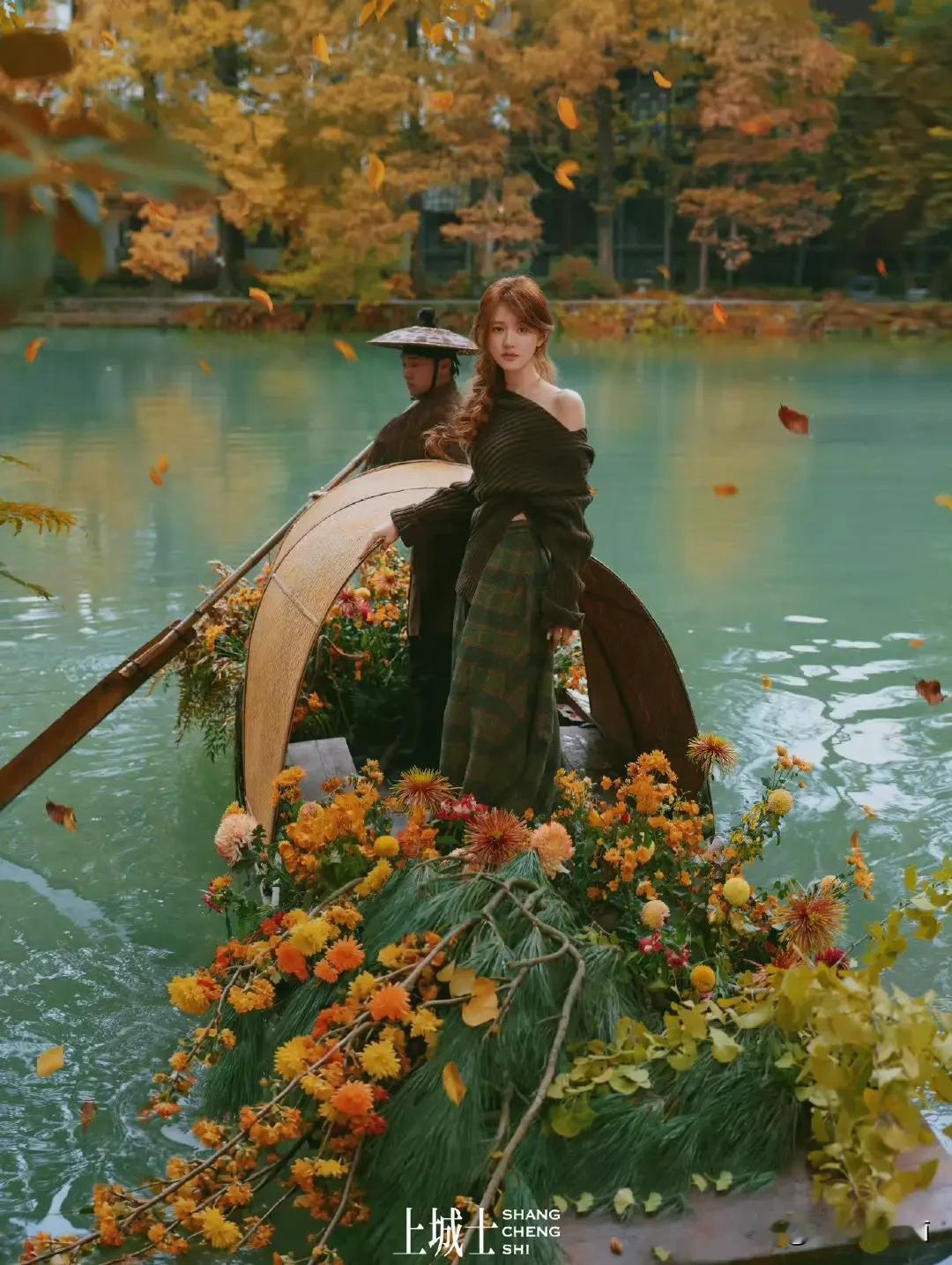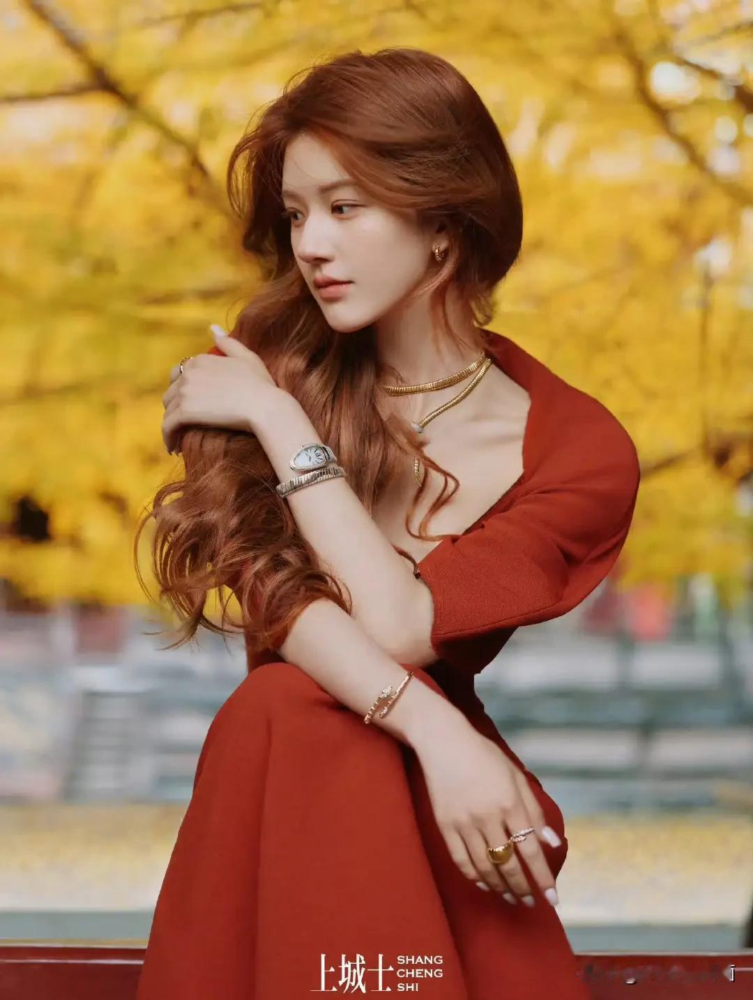 红色与金色的碰撞,温柔又大气。 身穿绿裙和身后的景色融为一体,就像一幅精彩的油画