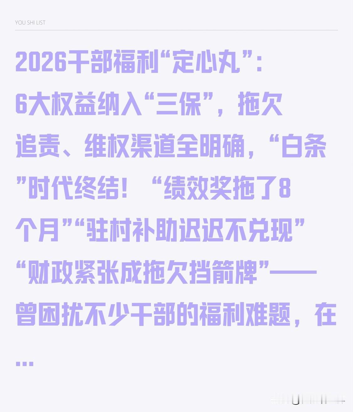 2026干部福利“定心丸”:6大权益纳入“三保”,拖欠追责、维权渠道全明确,“白条”时代终结! “绩效奖拖了8个月”“驻村补助迟迟不兑现”“财政紧张成拖欠挡箭牌”——曾困扰不少干部的福利难题,在2026年政策落地后将彻底改观。中央明确干部合法福利纳入“三保”刚性保障,地方不得再以财政压力为由推诿,从基本工资到年终绩效,从住房补贴到驻村补助,每一项权益都有了政策“硬靠山”。 一、“三保”兜底6大核心权益,政策边界清晰可查 此次政策明确,干部合法福利并非“模糊概念”,而是被财政部修订的《县级基本财力保障机制奖补资金管理办法》精准界定,全部纳入“保工资”核心范畴 : - 基本工资:国家统一标准的薪酬底线,不得随意克扣; - 规范性津补贴:地方合规发放的各类津贴,杜绝“变相减发”; - 住房补贴:多地已细化标准,如和田地区对博士、硕士、双一流本科生分别给予60万、40万、10万购房补贴 ; - 驻村补助:基层一线专项保障,丹凤县曾因拖欠15个月通信补助被巡察组督办整改,如今纳入硬性兑付清单 ; - 年终绩效考核奖:与考核结果挂钩的激励资金,怀化市明确嘉奖1500元、记功3000元,不计入绩效工资总额 ; - 其他法定福利:含带薪休假、健康体检等,张家川县已实现乡镇干部体检全覆盖、轮休应休尽休 。 关键亮点在于,中央下达超4100亿元奖补资金定向支持基层“三保” ,明确“县级为主、市级帮扶、省级兜底”原则,彻底堵死“财政紧张”的拖欠借口。竹溪县此前拖欠干部福利待遇236.45万元,通过“巡财联动”机制已全额追缴兑付 ,这类案例将成为2026年政策执行的常态。 二、遭遇拖欠不用慌,3步维权通道畅通无阻 政策落地的核心是“可落地、可维权”,针对福利拖欠问题,官方明确了阶梯式解决路径,每一步都有制度支撑: 1. 单位内部问询:先向财务或人事部门提交书面咨询,要求明确拖欠原因及兑付时间表,留存沟通记录; 2. 层级递进反映:若15日内未获明确答复,可向当地财政局提交异议申请,或通过“互联网+督查”平台实名反馈; 3. 纪检监察督办:对恶意拖欠、截留的,直接向纪检监察机关举报。丹凤县水利局拖欠下乡补助近2年,巡察组介入后半个月内即全额补发4.7万余元 ,证明监督渠道高效有力。 更具威慑力的是,干部福利保障情况已纳入地方政府考核核心指标,与政绩直接挂钩。贵州大方县曾因拖欠教师工资补贴4.8亿元,导致县长停职、两名副县长免职,此类追责案例将成为2026年的“高压线”——对拖欠行为不仅要“补旧账”,还要追究相关责任人责任。 三、福利保障不是“养懒汉”,而是干事创业的“加油站” 不少人疑惑:强化干部福利保障会不会滋生惰性?答案恰恰相反。政策设计的深层逻辑的是“激励担当”:和田地区明确艰苦边远乡镇干部年度考核奖高于县直机关20%以上 ,龙里县建立村干部“3岗2类17级”薪酬体系,干得好、任期长则待遇高 ,形成“多劳多得、优绩优酬”的正向循环。 同时,政策也剑指“躺平式”干部。马尔康市两名干部因嫌资料上传繁琐,导致21名地质灾害监测员补助拖欠3年,最终被组织处理并补发7.56万元 。这意味着,福利保障与履职尽责绑定,既不让实干者吃亏,也不让懒政者得利,真正实现“组织为干部担当,干部为事业担当”。福利政策 职工福利新政 2025津贴 互动话题:你的福利权益落实到位了吗? 2026年福利保障政策的落地,是对干部辛勤付出的认可,更是对基层治理的优化。你是否遇到过福利拖欠的情况?当时是如何解决的?对于新政策的执行,你有哪些期待或建议?欢迎在评论区分享你的经历和看法,让我们一起监督政策落地,守护合法权益!