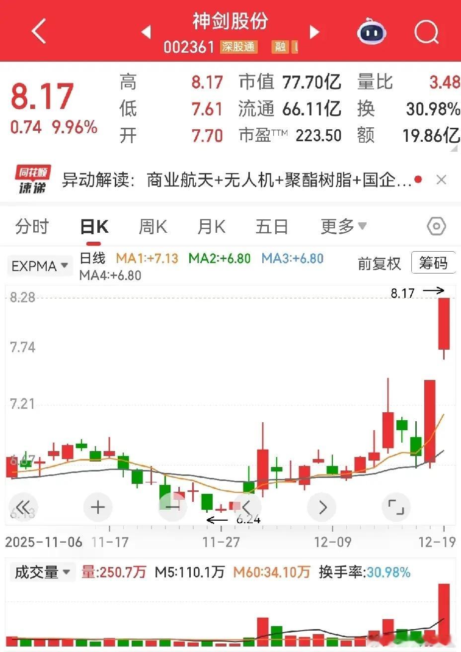 中超控股&神剑股份 短线走势怎么看?中超控股三进四失利,核心症结就是那天超50%的换手率!天量成交堆出的筹码压力,没大跌已经算强势,后续得靠时间慢慢消化。再看神剑股份,两连板拿下,第二板更是多倍量涨停,30%+换手率不算低。下周一重点盯量能,能持续放量冲三进四最好,不然大概率也要进入调整模式啦!投资建议仅供参考,股市有风险,入市需谨慎。