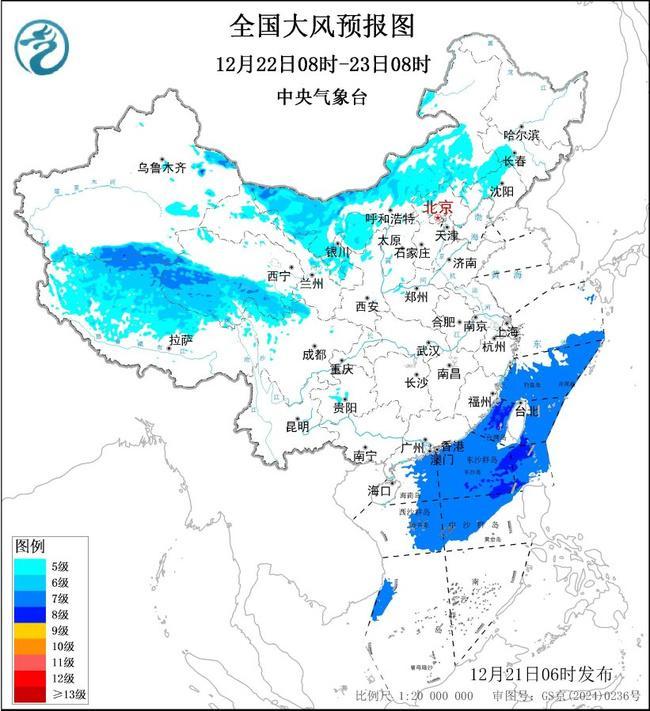 预计,12月21日08时至22日08时,内蒙古中东部、新疆北疆东部、西藏北部、青海西部、陕西北部等地有5~6级风,阵风6~8级;黄海大部海域、东海大部海域、台湾海峡、台湾以东洋面、巴士海峡、南海北部和中部海域将有7~8级、阵风9~10级的大风,其中台湾海峡的风力可达9级、阵风10~11级。