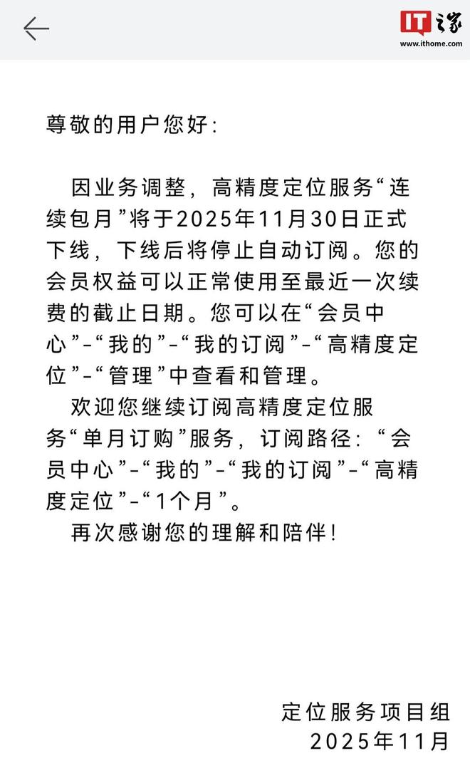 在今年11月,华为会员中心App发布公告,宣布因业务调整,高精度定位服务“连续包月”于2025年11月30日正式下线,下线后还将停止自动订阅。