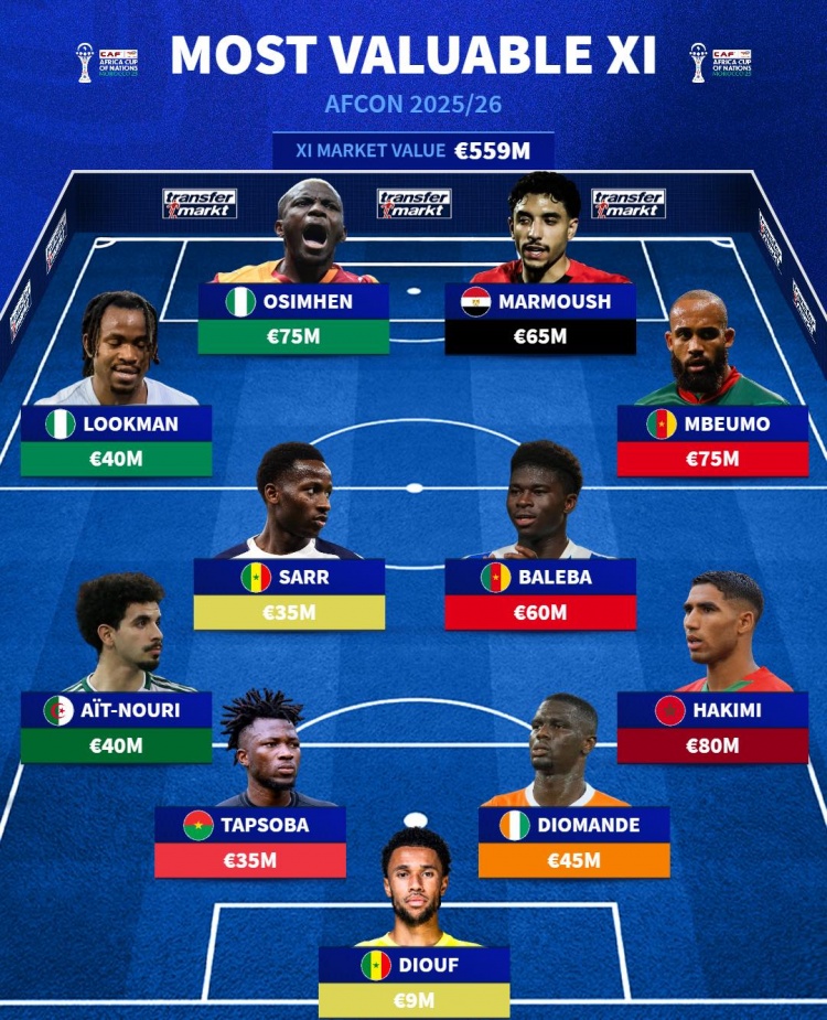 本届非洲杯身价最高阵容(总价5.59亿欧):
