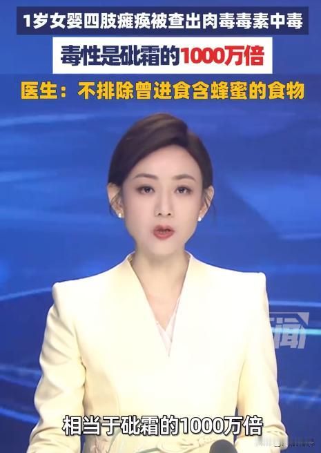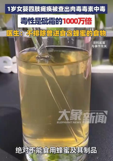 “悲剧还是发生了!”近日,福建福州,1岁女婴吃完蜂蜜后,突发四肢无力,迅速瘫痪,被紧急送医,竟被查出是肉毒毒素中毒,毒性是砒霜的1000万倍,医生推测是蜂蜜导致的。网友:1岁不吃盐,2岁不吃糖,3岁不吃蜜! 据媒体10月23日报道,福州一户人家突然发现,家中年仅1岁的女娃娃全身无力,四肢瘫痪,他们赶紧把孩子送往医院诊治。初步检查结果出来后,显示是肉毒毒素中毒,一家人都懵了:孩子吃喝、接触的东西都很注意,怎么会突然中毒了? 更让他们震惊的是,据医生说,这种肉毒毒素的毒性非常强烈,是砒霜的1000万倍!医生还推测,这很有可能是孩子家人之前给她吃了蜂蜜或者含有蜂蜜的食物导致的。 蜂蜜对于大人来说是滋补的好东西,但是对于3周岁以下的,肠胃功能还没有发育完全的婴幼儿来说,无异于致命毒药。这是因为他们的肠胃中没有形成完整的微生态菌群,一旦蜂蜜中的肉毒杆菌进入肠道,很容易繁殖,然后产生毒素,被吸收进血液中,流向全身,导致中毒。 所以大家在给小宝宝吃东西的时候,一定要注意不要给他们吃蜂蜜。老人不是也常说,1岁不吃盐,2岁不吃糖,3岁不吃蜜吗?所以说,有些老话流传到现在是有道理的,不信不行啊! 信息来源:《女婴四肢瘫痪肉毒毒素中毒,医生:不排除曾进食含蜂蜜的食物》大象新闻