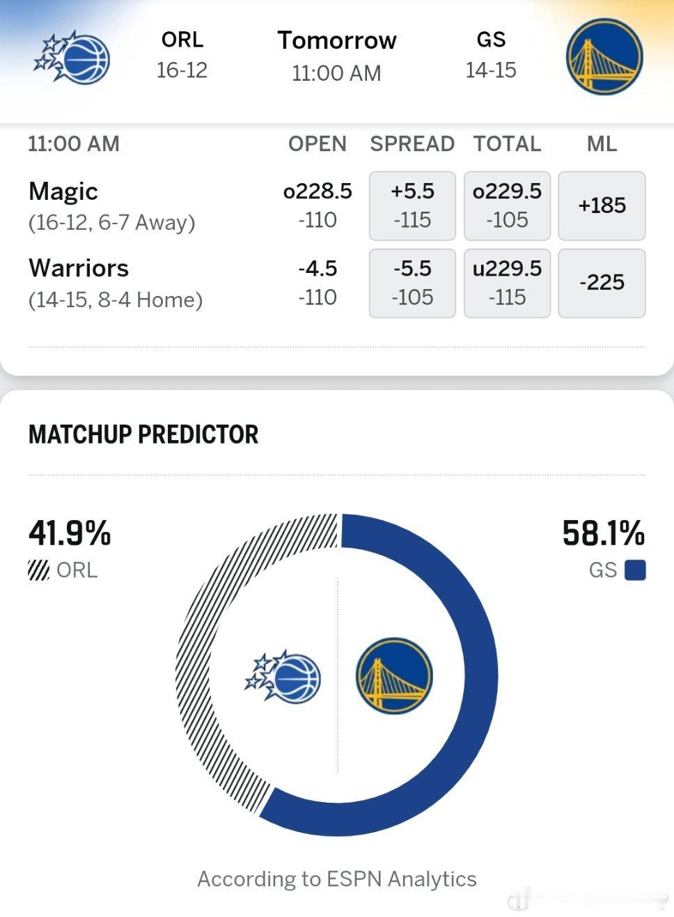比赛预告:明天上午11:00,勇士坐镇主场迎战魔术队。目前魔术的三分出手/投进/命中率均为联盟垫底级别。😐勇士伤病报告:库明加复出,霍福德、塞斯库里继续缺席魔术伤病报告:席瓦尔出战成疑,萨格斯大概率缺席,大小瓦格纳均缺席ESPN预测双方胜率:勇士58.1%,魔术41.9%,勇士-5.5分