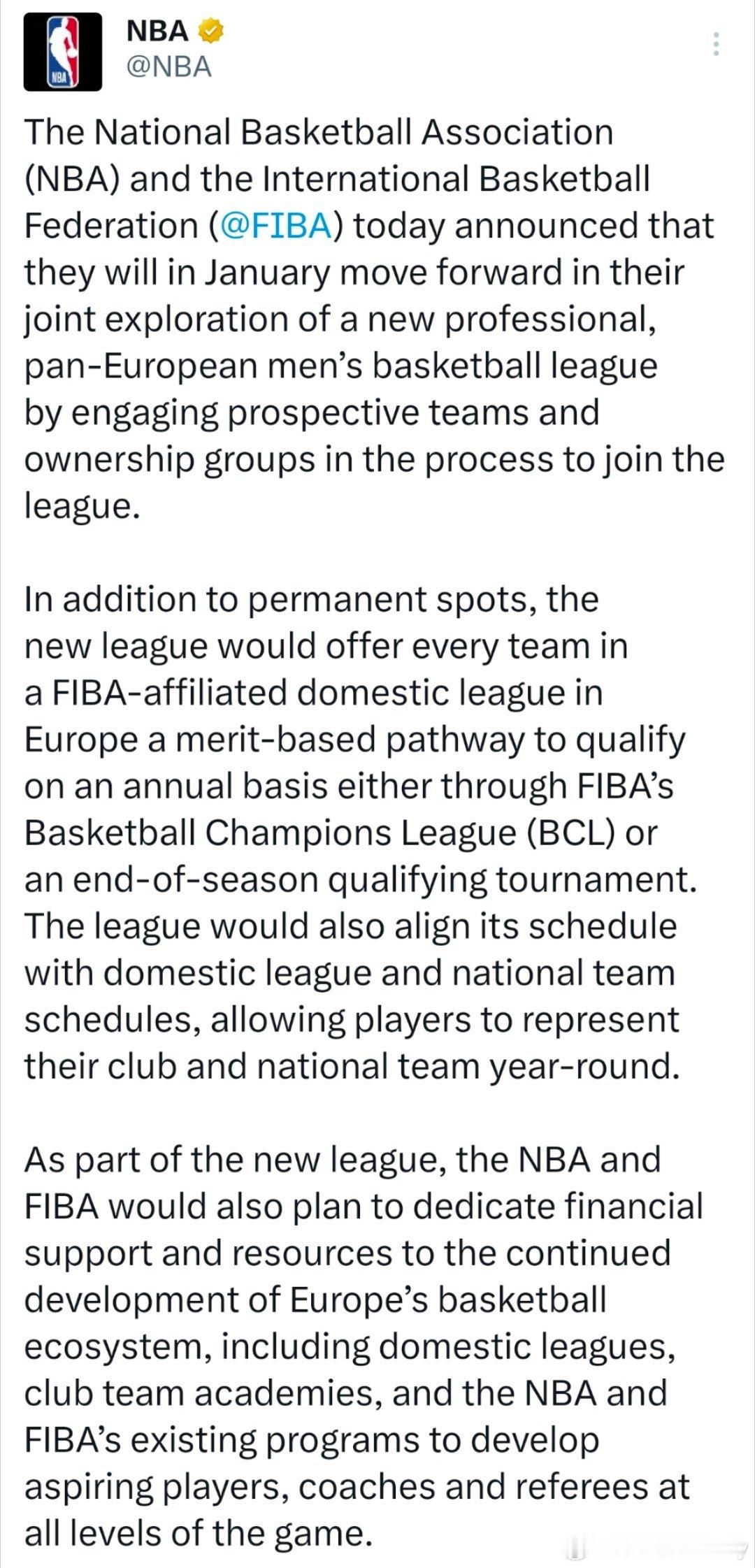 NBA和FIBA宣布,将于明年1月继续探讨推动组建新联赛——泛欧洲男篮职业联赛,