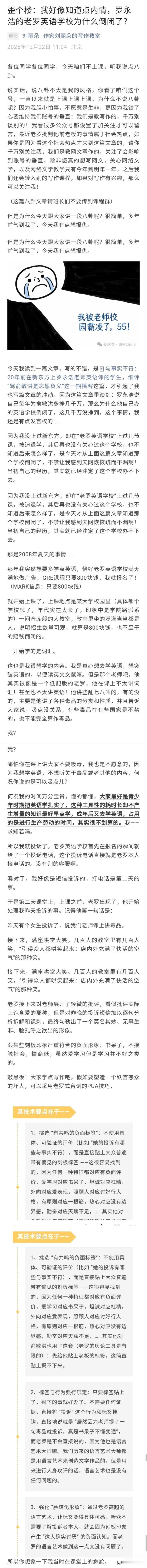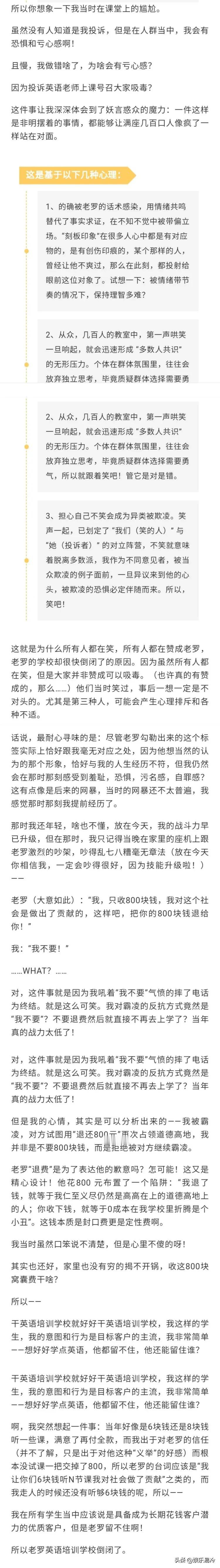 老罗英语培训还没倒闭的时候,有个老师在课上宣传D吸点没关系,这位老师还说有些D品在其他国家都不算D品。 有位有良知的女学生下了课马上发短信向罗永浩投诉,令她万万想不到的是,罗永浩非但没有批评老师,反而把她形容成一个莫名其妙无事生非的人。 女学生很生气,晚上打电话给罗永浩,罗永浩的回应是,“我收了你800块学费,我把800块钱退给你。” 多年后这位女学生成了女作家,在她得知老罗英语培训已经倒闭后,她内心感慨:天网恢恢,疏而不漏啊!