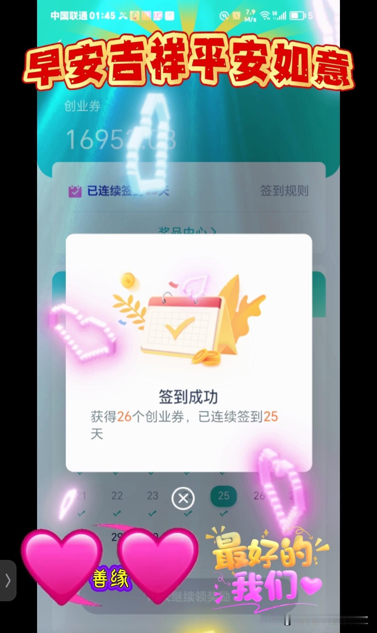 早安吉祥平安如意 签到成功 获得26个创业券,已连续签到25天 忙忙碌碌快一年
