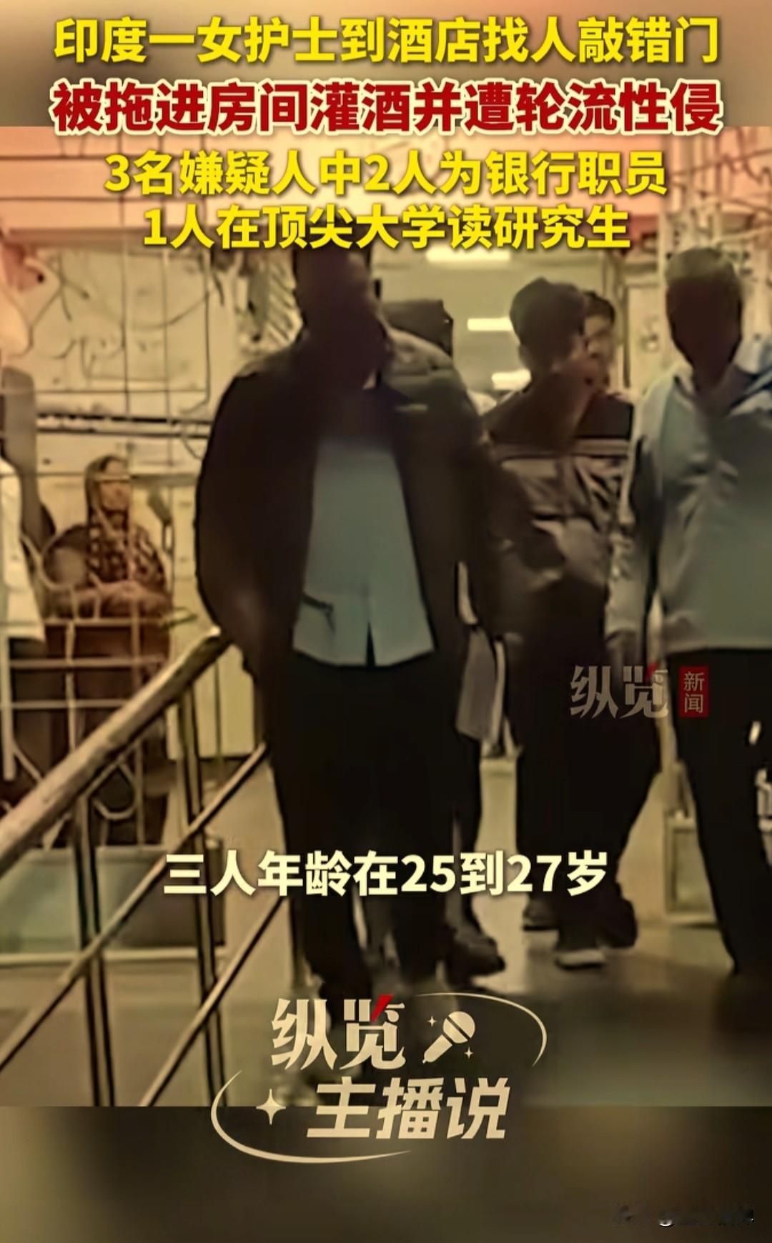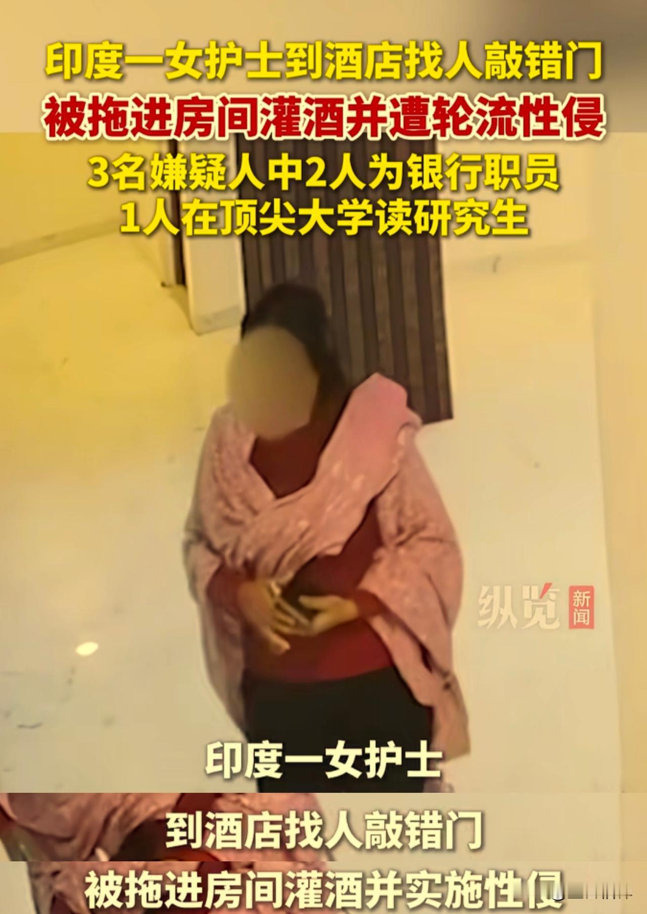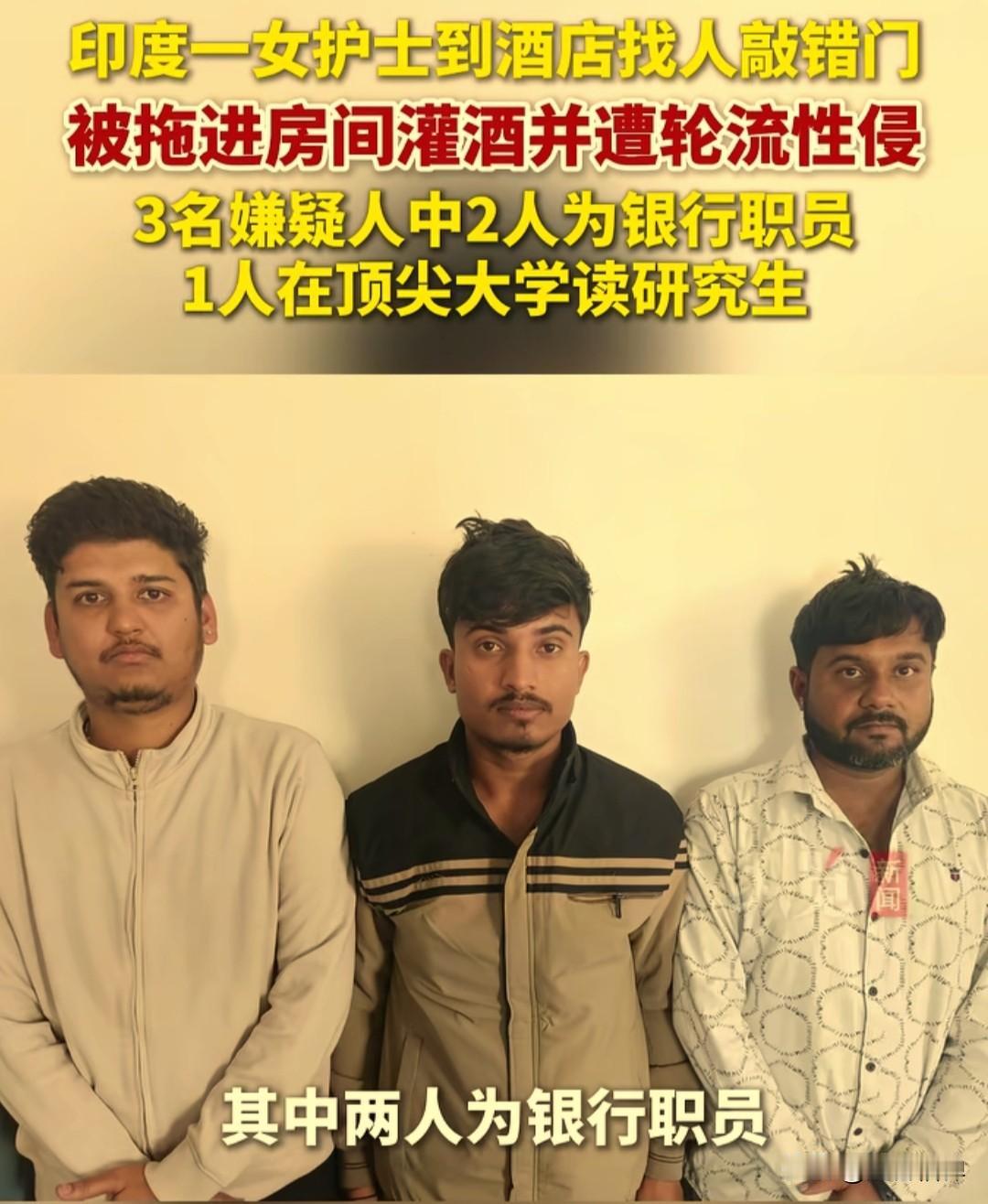 印度一名女护士去酒店找朋友,没想到敲错了房间,被拖进房间惨遭轮流性侵,这三名嫌犯里面两人还是银行职员,有一人在顶尖大学读研究生。 根据印度媒体和国际媒体的报道,2025年12月7日深夜,在印度马哈拉施特拉邦的火车站附近的一家酒店,一名30岁的已婚女护士,去酒店105房间找朋友,但是找错地方敲了205号房间。 房间里面有三名男子在喝酒,听到有人敲门就开门,看到是一名女子后,说你要找的朋友在房间里面,强行将这名女护士拉了进去并将房门反锁了。 女子被拉进去之后他们三人强迫让她喝酒,然后开始轮流性侵她,女子遭性侵约4个小时,后想办法逃了出来报了警。 警方接到报案后,随后逮捕了这三名男子,没想到这三人身份都是有正当职业的年轻人,其中两人是银行职员,另外一人是顶尖大学的MBA研究生。 据印度国家犯罪记录局的数据显示,印度每16分钟就会报告一起强奸案。尽管2012年德里黑公交LJ案后修订了更严厉的法案,但案件数量并未显著下降。