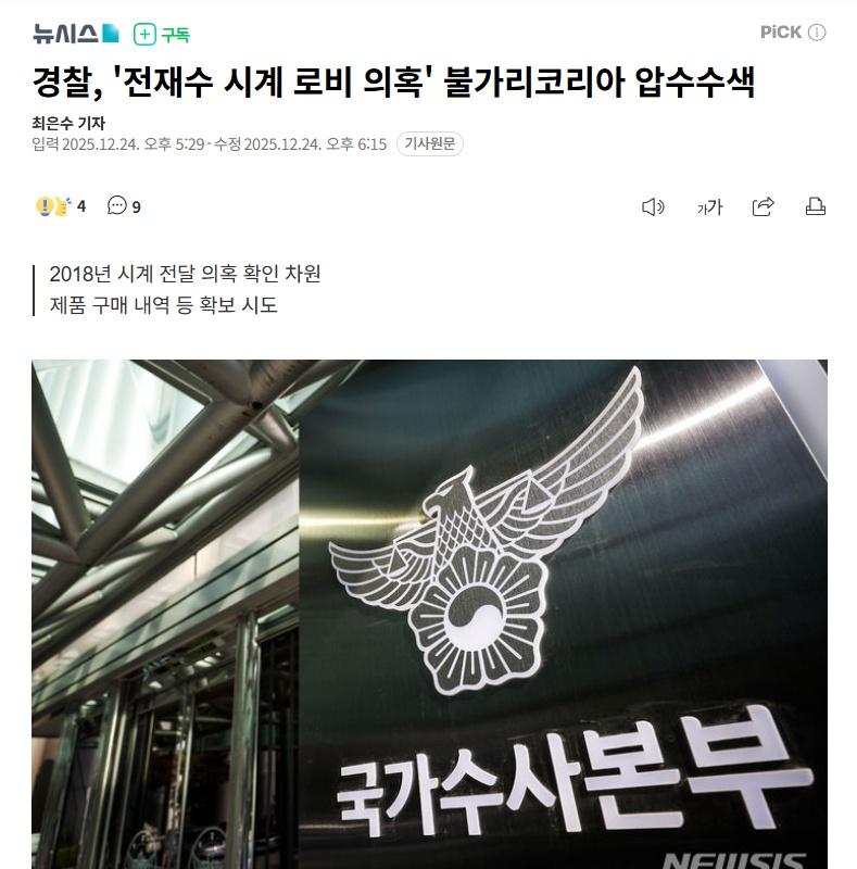 【韩国警方就"贿赂嫌疑"对宝格丽韩国公司进行扣押搜查】韩警方突击搜查宝格丽韩国总部海外新鲜事热点现场 正在调查统一教对政界行贿嫌疑的韩国警方,根据有关向共同民主党议员田载秀(前海洋水产部长官)赠送名牌手表的陈述,为确认相关产品的购买记录,对宝格丽韩国公司实施了扣押搜查。 韩国警察厅国家搜查本部特别专案调查组表示,已从法院获得追加扣押搜查令,并于23日派遣调查官前往位于首尔瑞草区的宝格丽韩国公司总部等地进行了扣押搜查。 警方解释说,此次调查是为了确认2018年涉嫌转交给全议员的高价手表的购买记录等。 此前,前世界本部长尹永浩在今年8月金建希特检调查中陈述称,曾于2018年以韩日海底隧道等教团议题的请托为目的,向全议员赠送现金和名牌手表。 警方从特检组接手案件后,于本月15日对全议员的住宅、议员室办公室等4处地点进行了扣押搜查。当时的搜查令中明确记载了"赠送了2000万韩元现金和一块价值1000万韩元的宝格丽手表"。 全议员目前因涉嫌受贿和违反《政治资金法》被立案,并于19日前往警方接受了首次嫌疑人调查。他当时对媒体表示:"与韩日海底隧道相关的请托或收受金钱财物均非事实",全面否认了嫌疑。 由于违反《政治资金法》嫌疑的公诉时效即将届满,据悉警方正在考虑近期内再次传唤前长官田载秀。 韩警方突击搜查宝格丽韩国总部