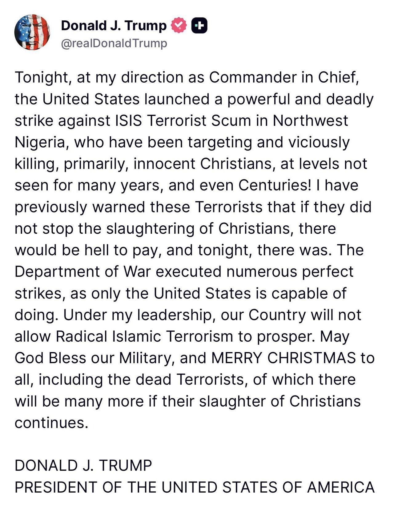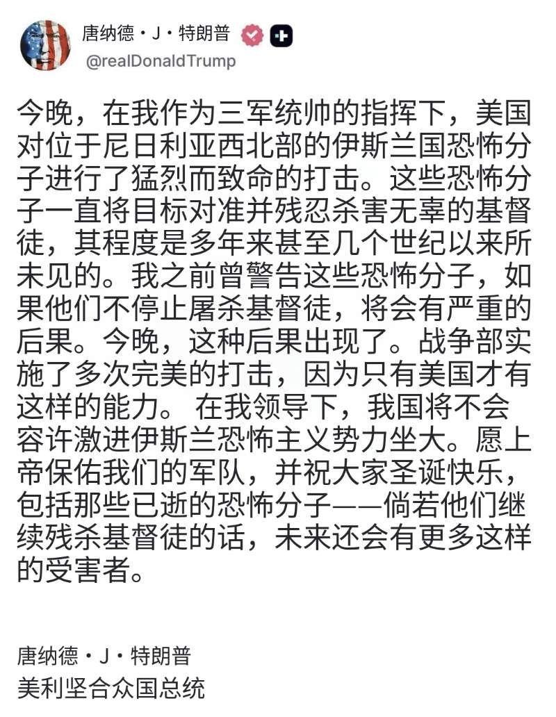 突发新闻:特朗普当地时间12月25日晚发文表示:“今晚,在我作为三军统帅的指挥下,美国对位于尼日利亚西北部的伊斯兰国恐怖分子进行了猛烈而致命的打击。这些恐怖分子一直将目标对准并残忍杀害无辜的基督徒,其程度是多年来甚至几个世纪以来所未见的。我之前曾警告这些恐怖分子,如果他们不停止屠杀基督徒,将会有严重的后果。今晚,这种后果出现了。战争部实施了多次完美的打击,因为只有美国才有这样的能力。在我领导下,我国将不会容许激进伊斯兰恐怖主义势力坐大。愿上帝保佑我们的军队,也祝大家圣诞快乐——包括那些被消灭的恐怖分子。如果他们继续屠杀基督徒,还会有更多恐怖分子迎来同样的下场。”