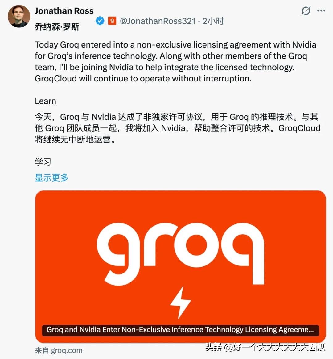 黄仁勋对谷歌TPU定制芯片的战斗打响了, 他的第一个动作就是200亿拿下了AI芯片初创公司Groq。 而且黄仁勋最聪明的是这次交易并不是直接收购Groq, 而是英伟达获得了Groq推理技术的非独家授权, Groq仍然是自主经营, 同时Groq创始人兼CEO、总裁以及其他高管将加入英伟达, 说明了黄仁勋要的不仅仅是技术更是这帮为谷歌TPU奠基的核心班底。 这一动作直接打到谷歌的要害, 看来英伟达捍卫AI算力老大的决心太强!