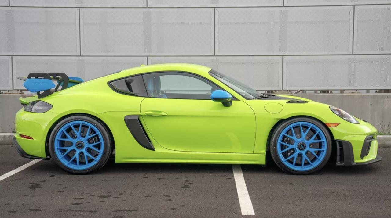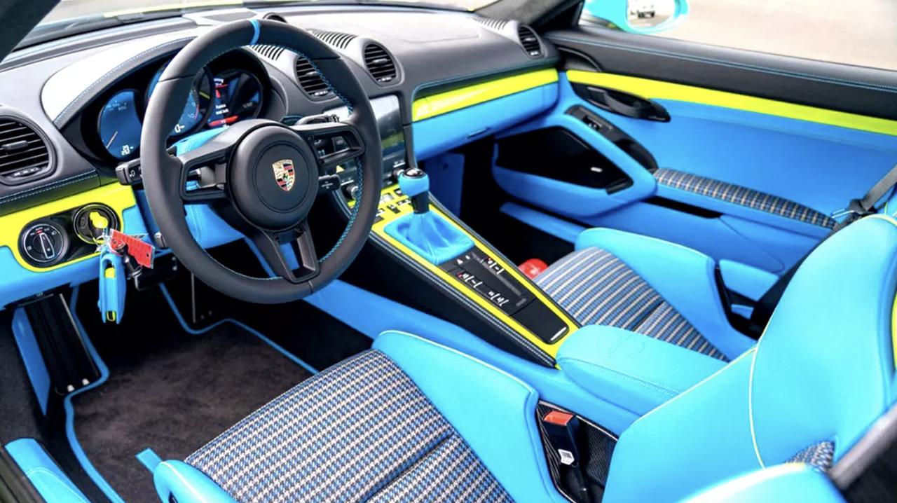 保时捷Sonderwunsch再出神作: 贝尔维尤中心挂出一辆“荧光笔”GT4 RS,桦木绿车身配湖蓝轮毂、后视镜、尾翼端板与NACA进气口,车尾字标也换蓝,远看像《玩具总动员》遥控车。座舱设计更浮夸,蓝色皮质包覆侧垫、头枕与仪表台,绿滚边勾勒黑皮织物拼接座椅,蓝色缝线贯穿中控与门板。整车额外选装费超5万美元!【来自懂车帝车友圈】