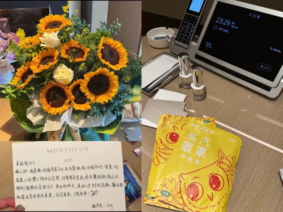 摩珀斯酒店会为客人免费提供蒸汽眼罩和睡眠香氛;客房服务员Lvy,注意到客人房间的毕业袍、毕业帽,不仅手写毕业祝福卡片,还把毕业帽和照片摆得整整齐齐;晚上又抱着一大束花上门送惊喜,让客人在“人生重要日子”里多了份温暖记忆。