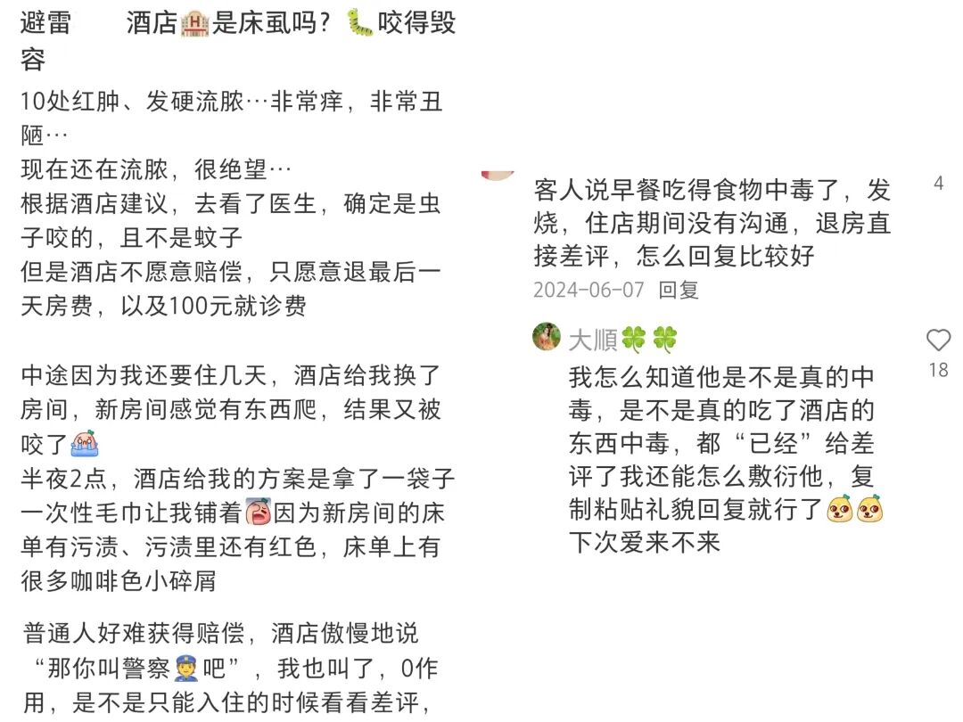 由于经常爆出旅客在外旅游住店时假装过敏,或以自带的虫子、毛发为犯罪工具,勒索酒店为其免单和给予赔偿等新闻。很多内地酒店陷入了一个怪圈:因为怕被讹诈,就对所有客人的需求都设防;因为想省麻烦,就把服务降到“最低标准”。