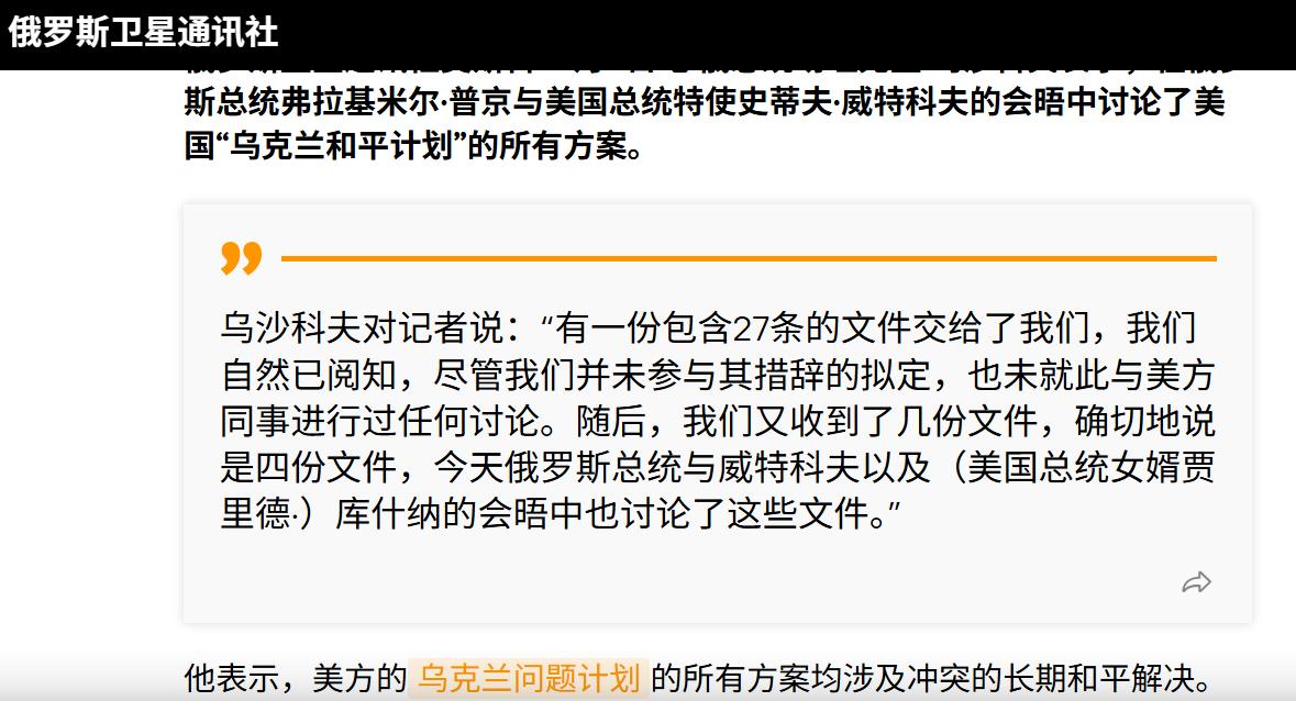 一开始,美国总统特使史蒂夫·威特科夫给出了一份包含27条的文件,俄罗斯方面看完这份文件后,没有与美国代表团进行任何讨论;