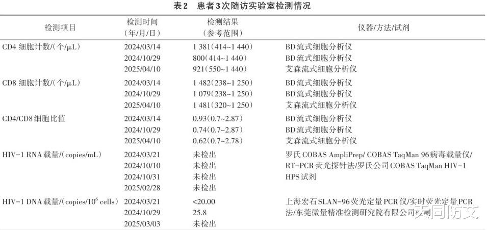 从2024年3月到2025年4月,患者共进行了三次随访,在这三次随访中,他的CD4和CD8细胞计数均未见异常,而HIV-RNA始终保持未检出。在HIV-DNA方面,第一次结果低于检出限,第二次结果略高于检出限(25.8 copies/10^6 cells),但仍属于极低水平,第三次结果则再次未检出。