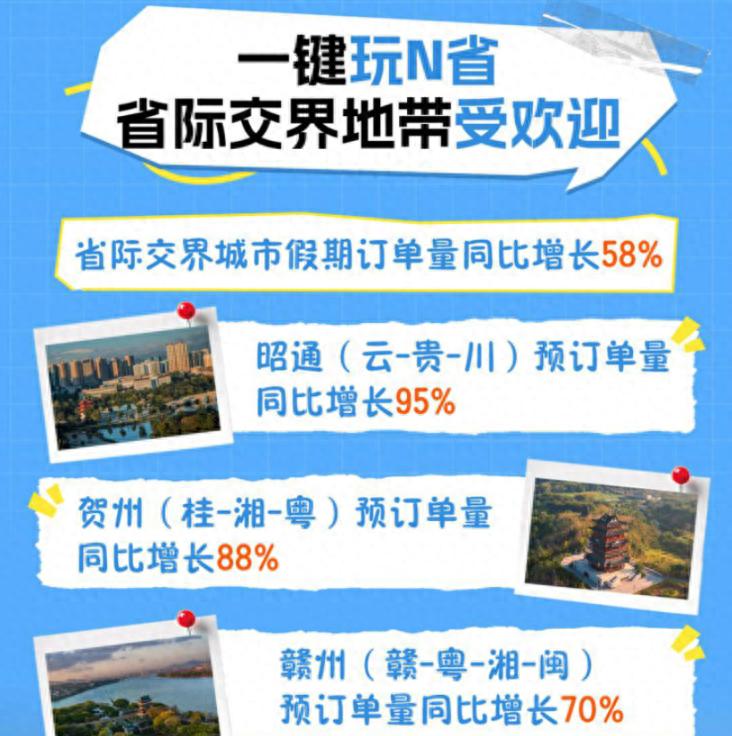 数据显示,河北清河县、围场满族蒙古族自治县等县域目的地,节前搜索热度持续上涨,吸引了大量追求小众体验的游客。除此以外,国内省际交界城市假期订单量也同比增长58%,像云南昭通、广西贺州等城市订单量分别增长95%、88%,“一次体验多省风情”的特色成为核心吸引力。