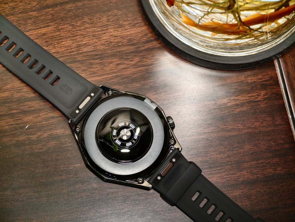 圆形传感器区域集成了多个通讯和监测元件,NFC、心率、血氧等一应俱全,印证了华为在健康监测领域的技术积累。