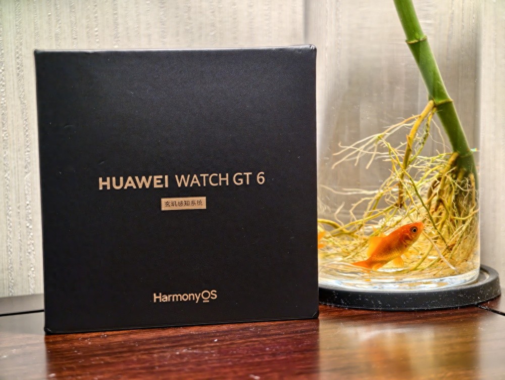 拿到华为WATCH GT 6的那一刻,精致的黑色礼盒包装就透露出旗舰般的质感。纯黑底色的盒子仅印有产品名称和“玄玑感知系统”六个汉字,下方标注着HarmonyOS标识,显得极简又大气。