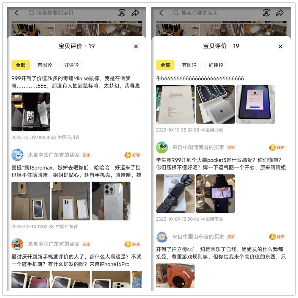 关键是这店铺看起来还像模像样,好评度100%,好评数52条,不是那种新店。点进历史评价还能看到“买家”们络绎不绝发布捡大漏的文案和照片,有人开到了价值几千的iPhone16 Pro Max,有人开到了大疆Pocket3,有人开到了拍立得SQ1,有人开到了iPad Pro13,反正就没有翻车的!