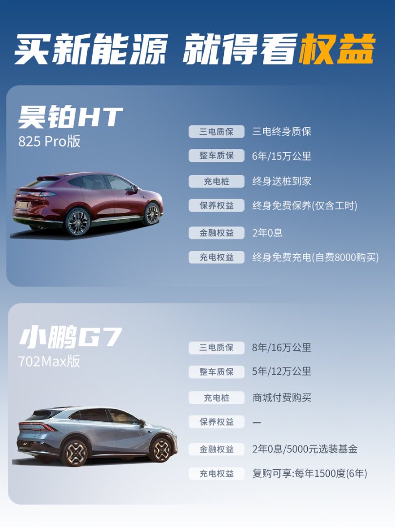 金融政策上,昊铂HT提供“0首付起、2年0息”金融方案,门槛比小鹏G7更低。叠加终身三电质保、免费保养、终身安心送桩到家权益,整体品价比凸显。