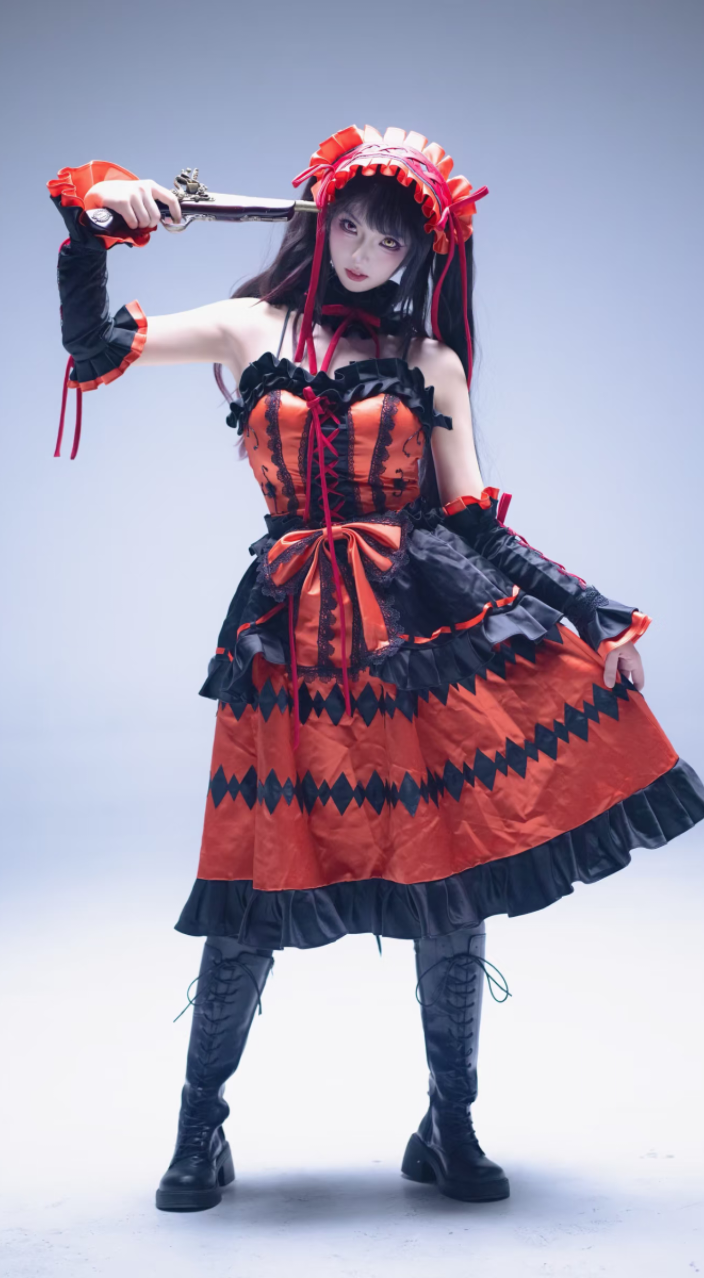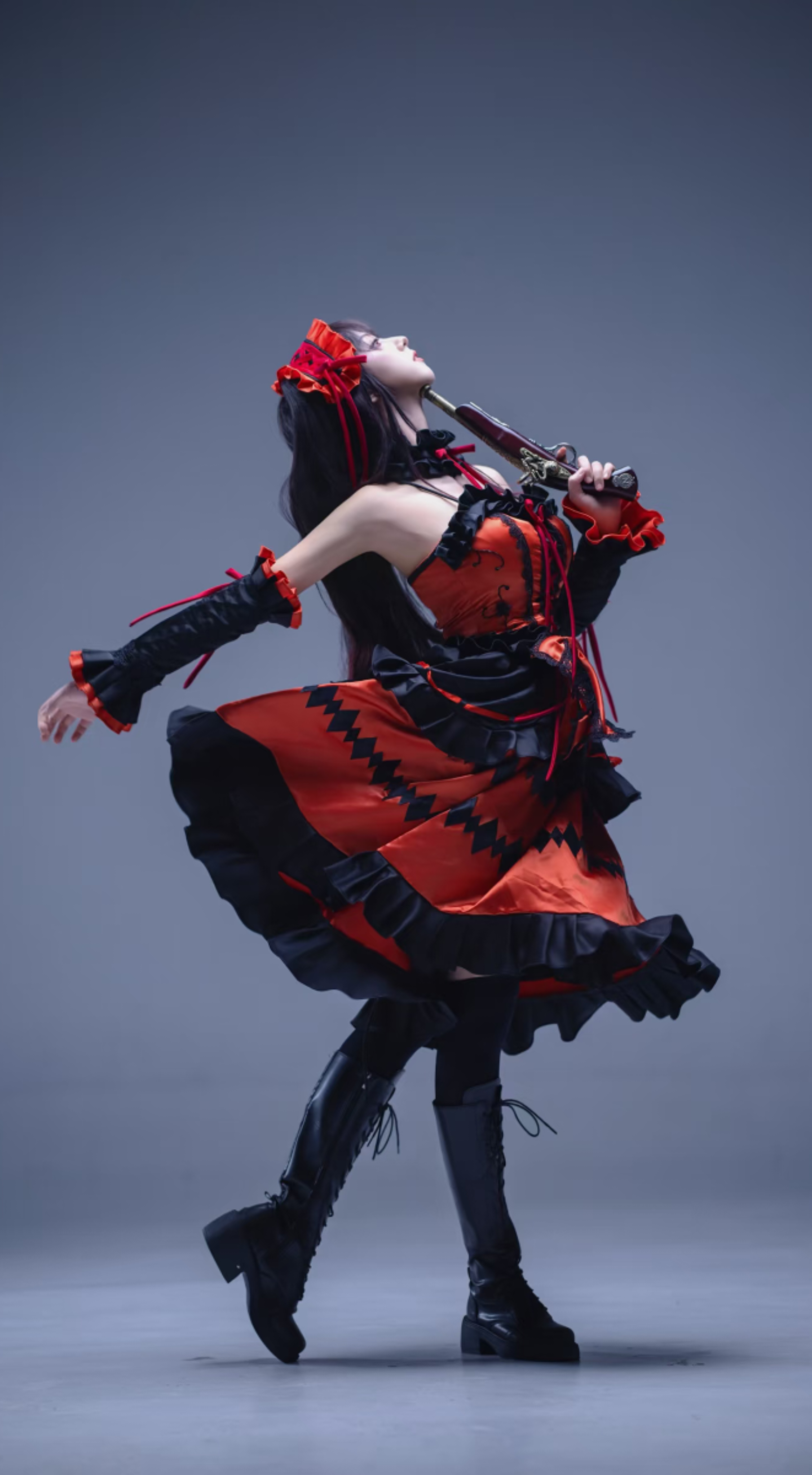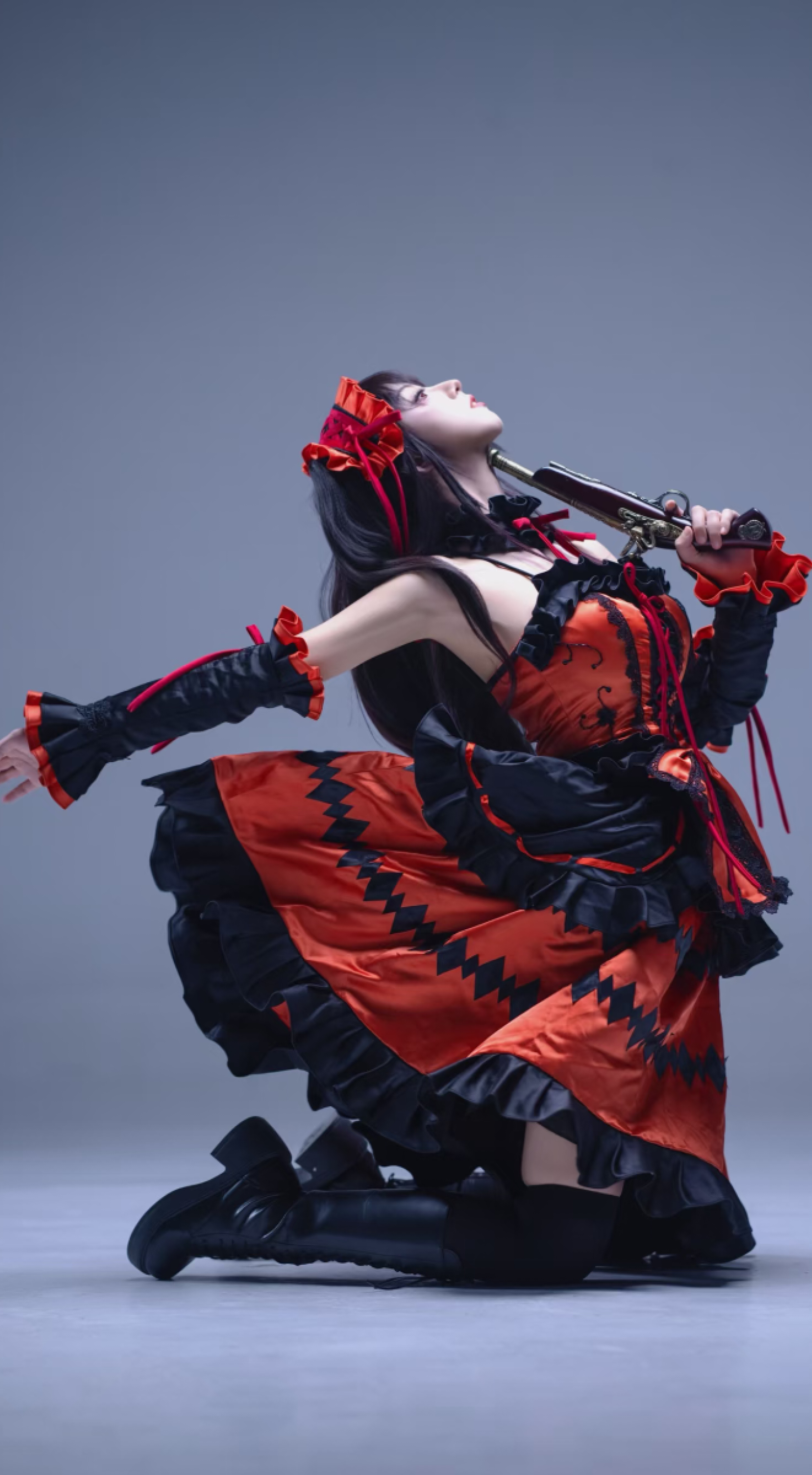狂三的标志性元素是 “红黑哥特裙 + 燧发枪”,这组 cos 把这两点焊死了: