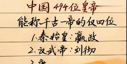 自中国历史上第一位皇帝秦始皇统一中国到清朝的满清皇帝嘉庆,经历了大约两千多年的时间,期间先后有494位皇帝。然而,在众多皇帝中,真正能够被誉为是千古一帝的,却只有四位,他们分别是汉武帝、唐太宗、宋太祖和明太祖。