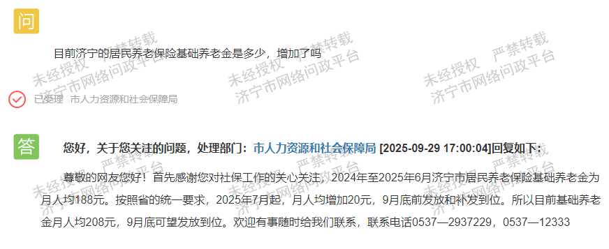 针对网友关注的问题,市人力资源和社会保障局作出回复表示,在2024年至2025年6月期间,济宁市居民养老保险基础养老金为月人均188元。按照全省统一部署要求,自2025年7月起,该标准上调,月人均增加20元。并且,增加部分的养老金将于9月底前完成发放和补发工作。所以目前基础养老金月人均208元,9月底可望发放到位。