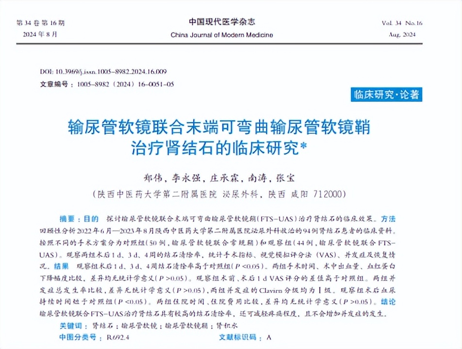 [1] 郑伟,李永强,庄承霖,等.输尿管软镜联合末端可弯曲输尿管软镜鞘治疗肾结石的临床研究[J].中国现代医学杂志,2024,34(16):51-55.