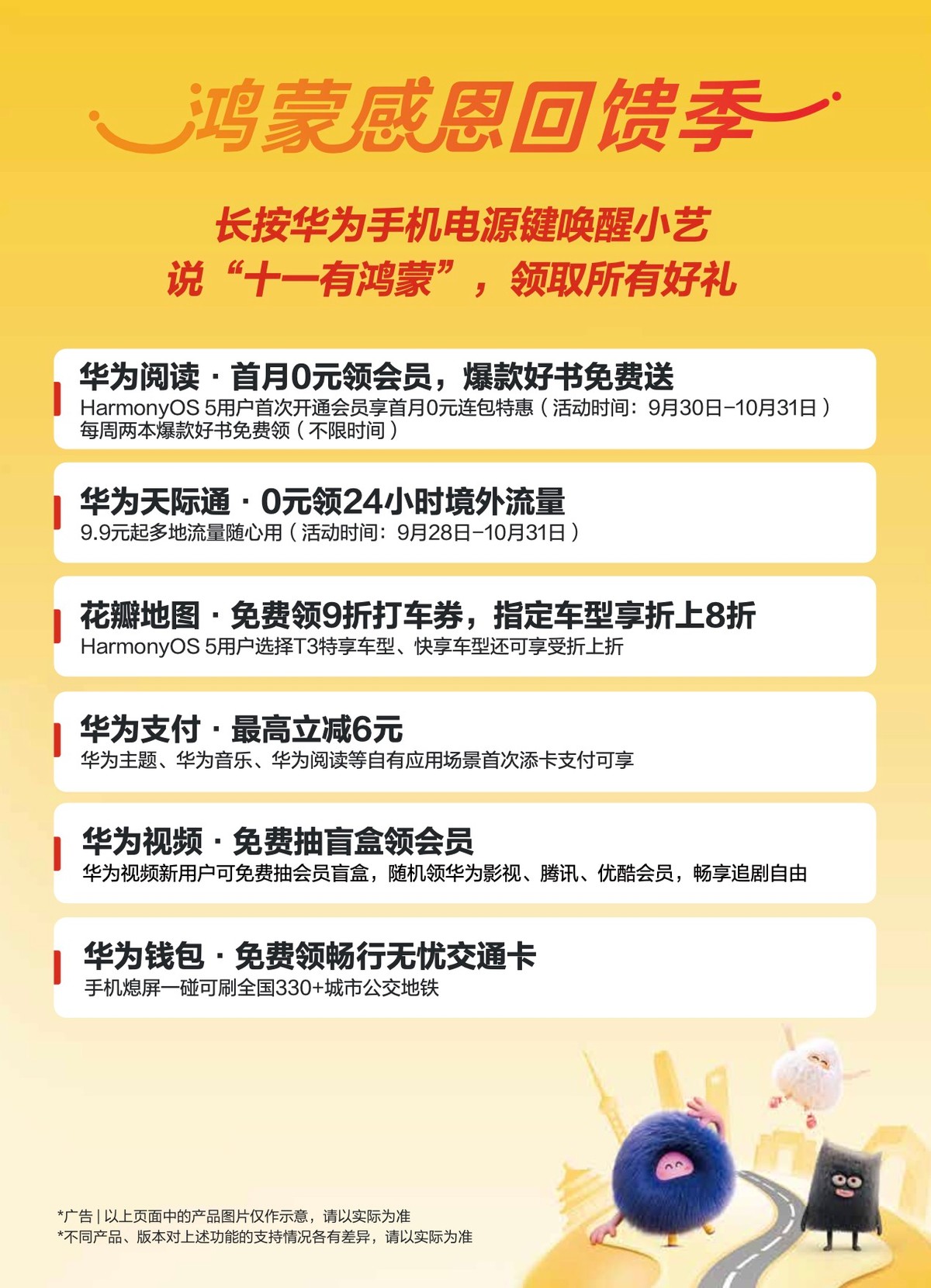 以前我总嫌长途出行又累又无聊,可现在有了华为音乐和华为阅读反而有点小期待。一个缓解了我路上奔波的疲惫,另一个让我重新爱上静静读书的感觉。如果你也经常需要长途出行,不妨试试用它们陪伴你的旅程。或许你会发现,路上的时光,原来也可以这么充实和自在。悄悄说一句,升级到HarmonyOS 5.1参与“鸿蒙有礼”的小伙伴,记得在9月30日前完成首次签到哦,每天签到都能轻松领会员、抽红包,超多惊喜好礼随机掉落!另外,长按华为手机电源键唤醒小艺,说“十一有鸿蒙”,还可领华为钱包免费交通卡、华为视频免费抽盲盒领会员等超值好礼,旅途幸福感直接满格!