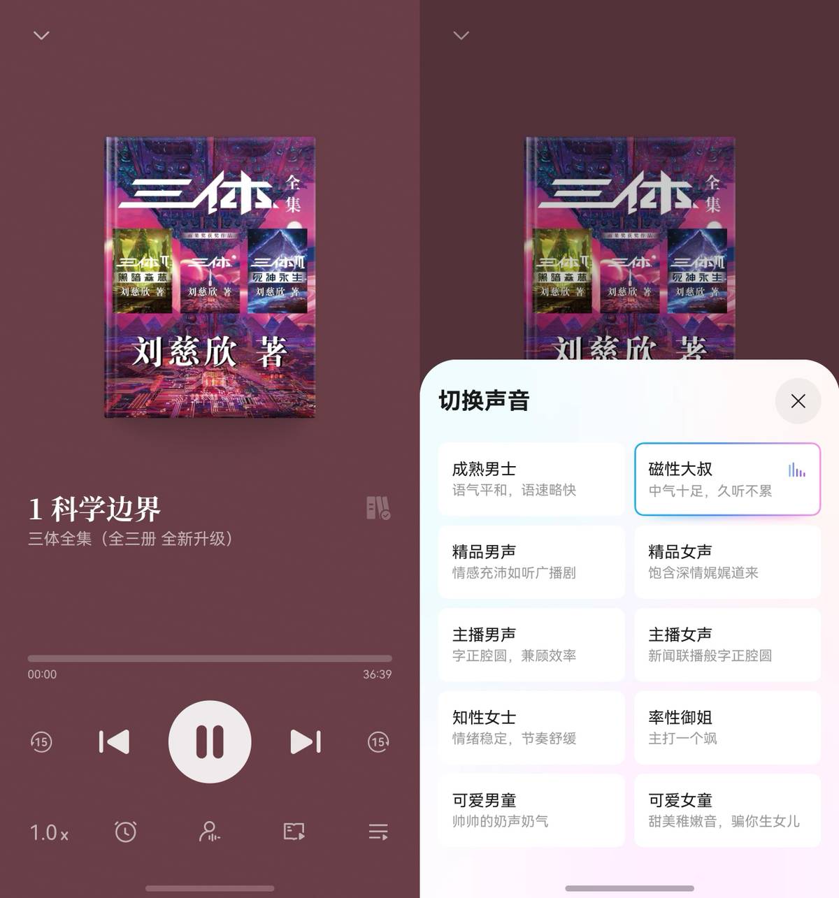 眼睛看累了也没关系,直接切换成听书模式,瞬间“解放双眼”。华为阅读能选的音色特别丰富,我个人最爱“磁性大叔”的声音,中气十足,沉稳有力。用它来听《三体》这种硬核科幻作品,代入感直接拉满,仿佛置身浩瀚宇宙。