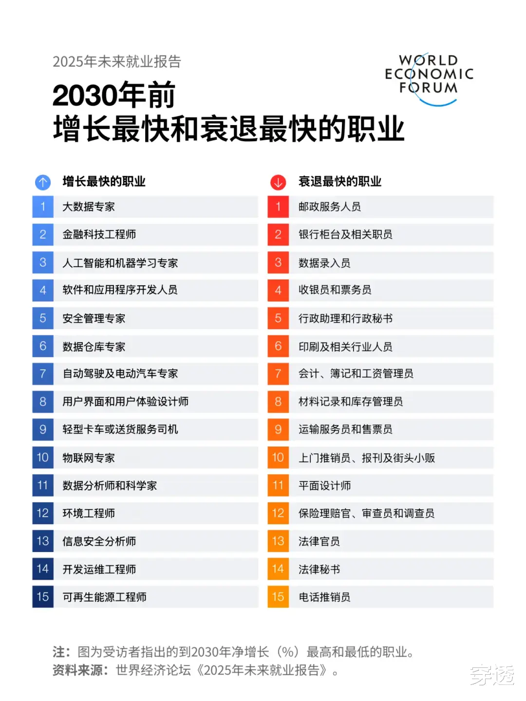 报告预测,2030年前,增长最快的三个职业是大数据专家、金融科技工程师以及人工智能和机器学习专家。