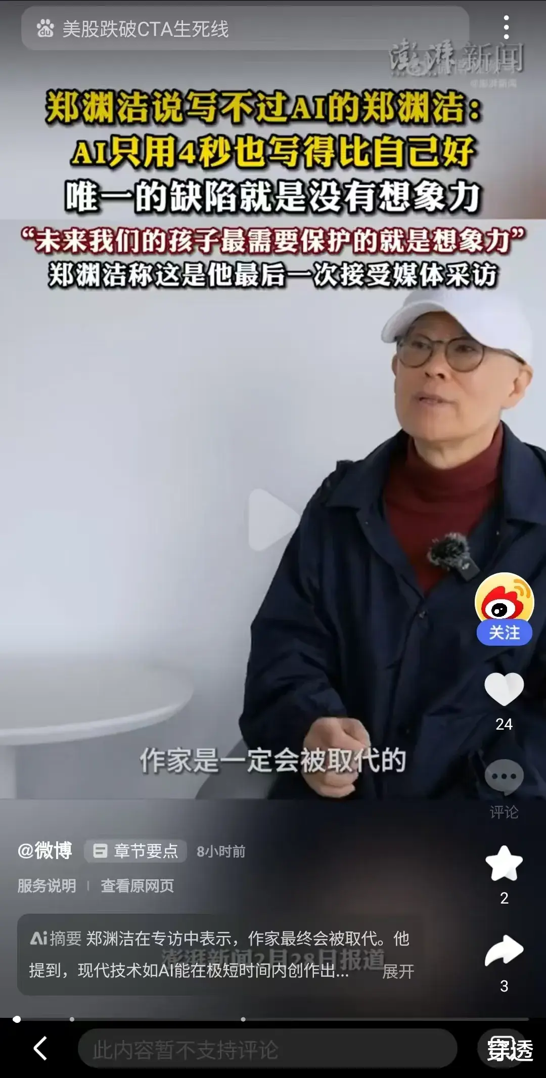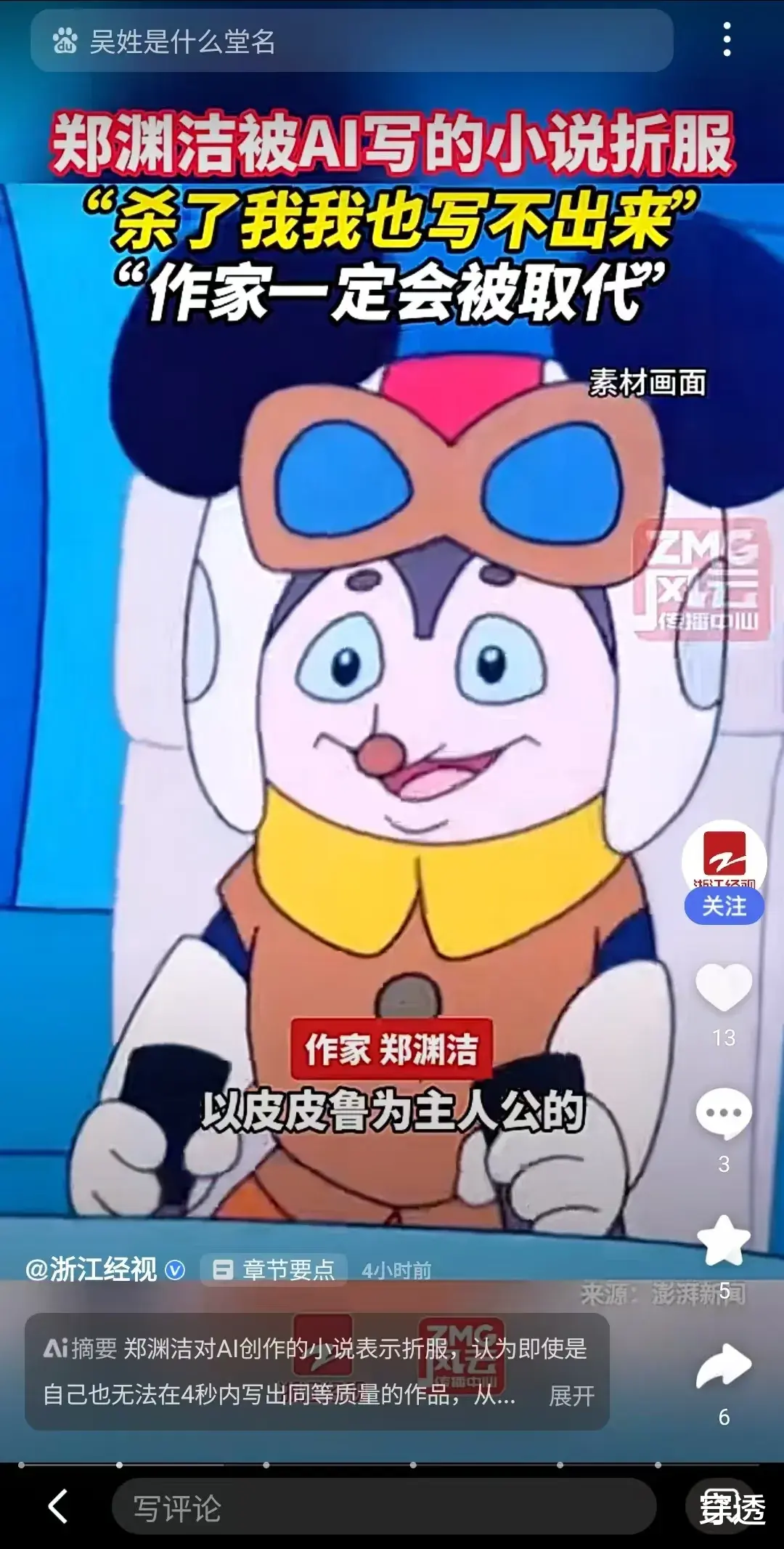 今天的热搜话题里,有几条AI话题格外醒目。先是“童话大王”郑渊洁的一段话让人破防,他今天宣布停更他所有社交账号,同时也谈了AI碾压他早前一部代表作的过程。他拿出曾经非常火爆的《皮皮鲁传》来对标。他设置好场景、人物和关系,让AI完成一篇作品,AI仅用了4秒钟。“看完之后,我承认自己写不过AI的郑渊洁。”