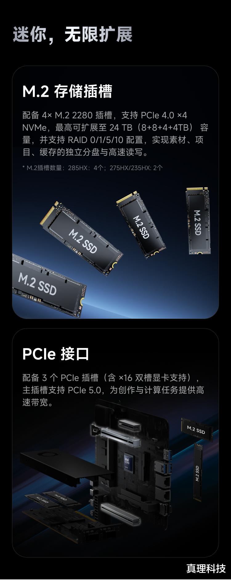 在此基础上,285HX版本配备M.2 PCIe 4.0 x4插槽,单槽最高支持4TB,支持RAID 0/1/5/10,项目、素材、缓存可分盘并行,彻底消除I/O瓶颈。在视频剪辑建模场景中,大型项目文件存储与读取变得轻松自如,剪辑师无需长时间等待素材加载,大幅提升工作效率。
