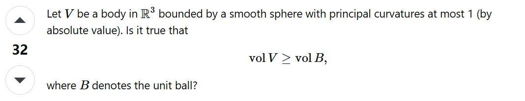 在三维欧几里得空间 R^3 中,若一个光滑沉浸球面的两个主曲率的绝对值都不超过 1,那么它所包围的体积是否至少不小于单位圆球的体积?