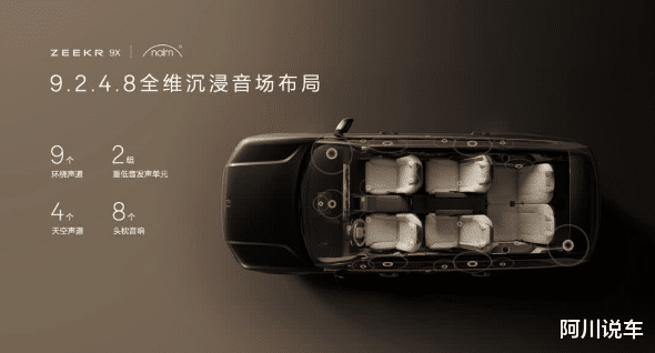 在此基础上,极氪与英国皇室御用音响品牌Naim深度合作,为极氪9X联手打造全球最大功率的车载音响。它拥有3868瓦的峰值功率,32个扬声器,支持杜比全景声,采用9个环绕声道、4个天空声道、8个头枕音响及2个低音炮,让每个座位都能享受殿堂级沉浸音效。