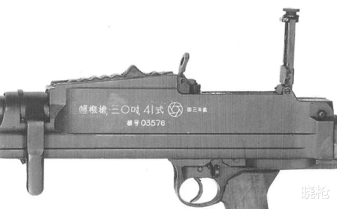△60厂生产的41式轻机枪。机匣左侧刻有“輕機槍,三〇吋,41式”的名称、60厂厂标(中间六个6,外面一个〇)、制造年份“四三年造”(1954),以及“槍号03576”