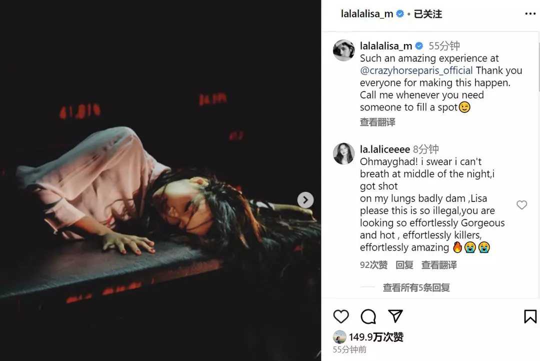时至今日,Lisa终于完成了她的五场疯马秀表演,就在今日她再次登上了热搜,不过这一次不是因为和LV三公子的恋情,而是在ins上发布了疯马秀看台舞台照。