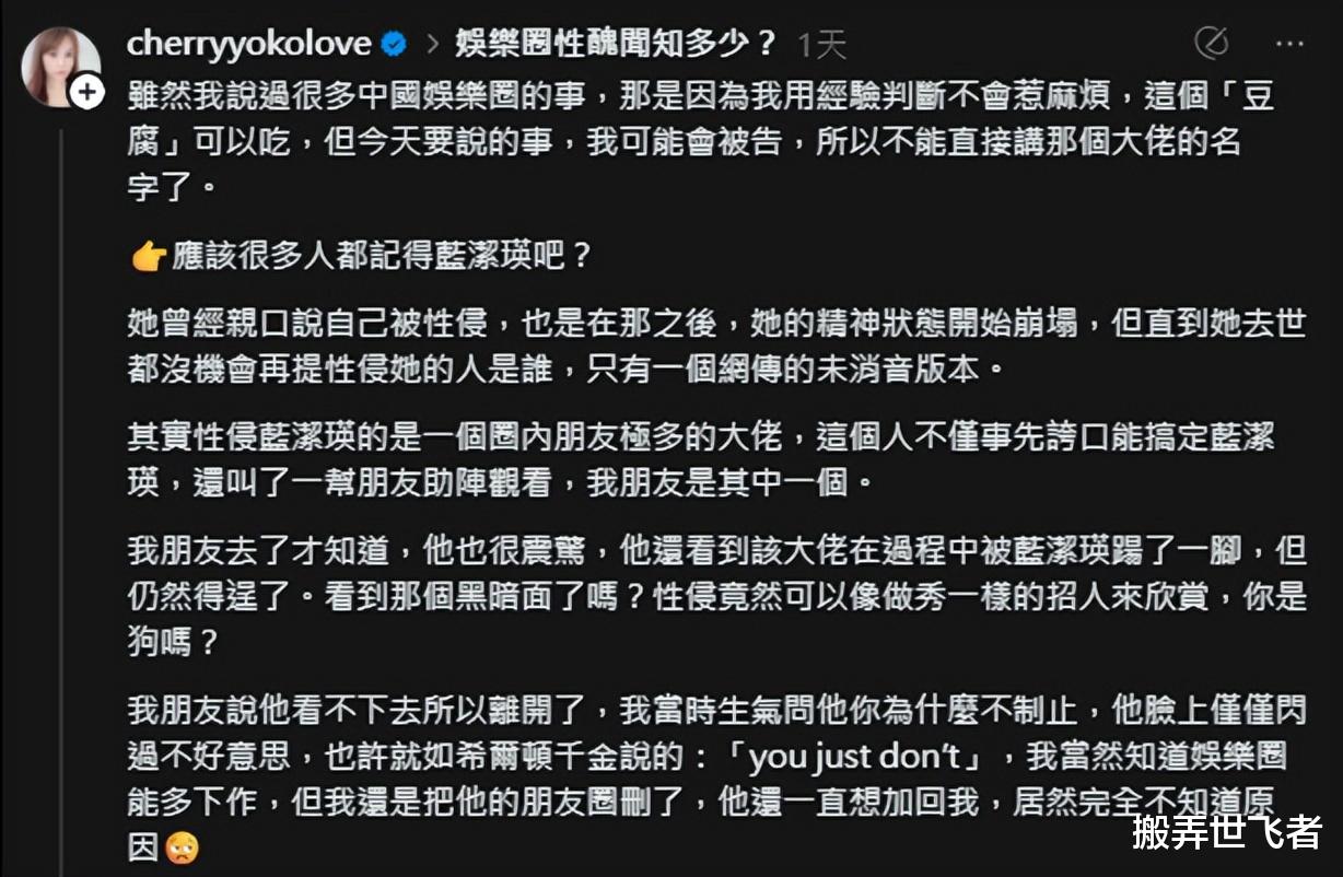 这位台湾爆料者在文中开篇便直言,自己以往分享大陆娱乐圈的事,都是经过判断 “不会惹麻烦” 才开口,但此次要讲的内容 “可能会被告”,因此无法直接透露大佬的名字。即便如此,她仍选择揭开这段往事,只因看不惯当年的黑暗:“虽然有风险,但还是想让大家知道那些不为人知的角落。”