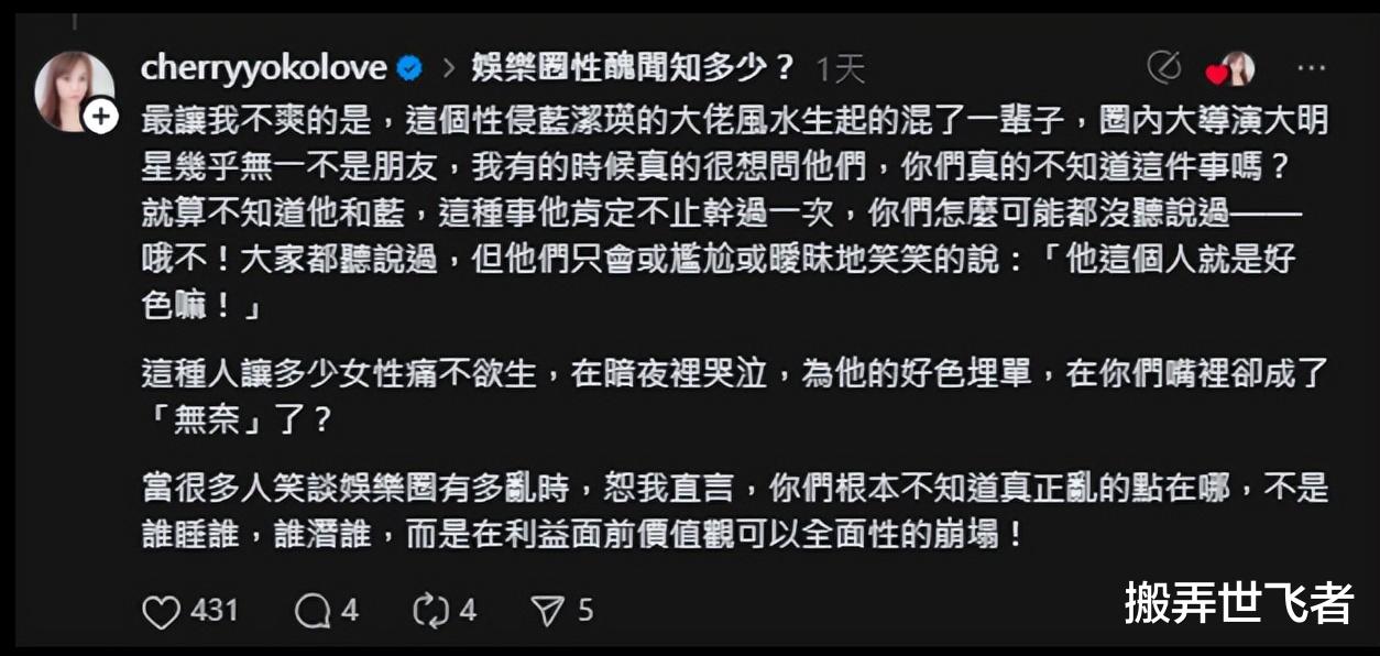 尽管爆料者始终没有点明性侵蓝洁瑛的大佬是谁,但她明确指出,这位大佬 “风水生起的混了一辈子,圈内大导演大明星几乎无一不是朋友”—— 可见其在演艺圈的人脉之广、地位之稳固。