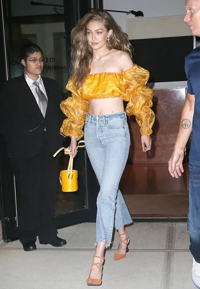 吉吉·哈迪德在纽约外出时穿着一件金色丝绸短款上衣,这件质感的上衣以透视蓬蓬袖为特色,吉吉搭配了素色的浅洗的牛仔裤。小李子的前女友把柔滑的浅金发梳成大波浪,放到耳朵的一侧,露出吊坠耳环。吉吉还选择了与华丽上衣匹配的黄色圆筒单肩包和别致的中跟鞋,女人味十足。