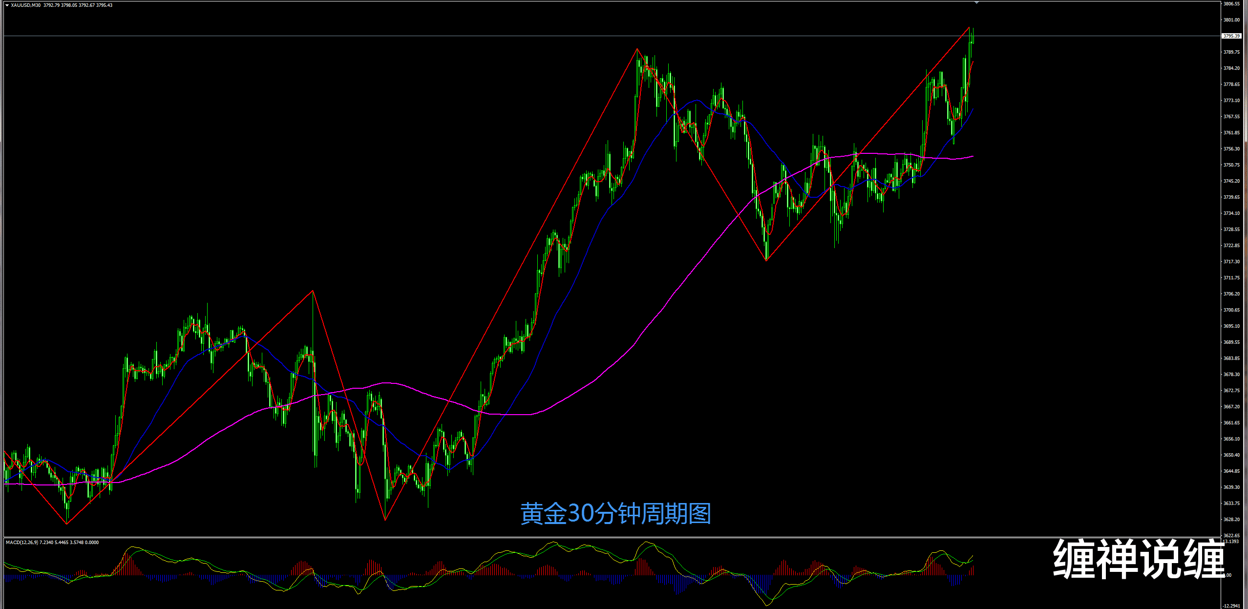 黄金30分钟延续上涨,黄金短线回撤还是继续顺势多,黄金30分钟回撤只要不跌破3757,那么黄金30分钟还是在上涨的过程中。黄金回撤还是继续顺势做多。黄金短线回撤3765附近支撑可以继续顺势多。黄金多头强势延续,短线顺势继续多!
